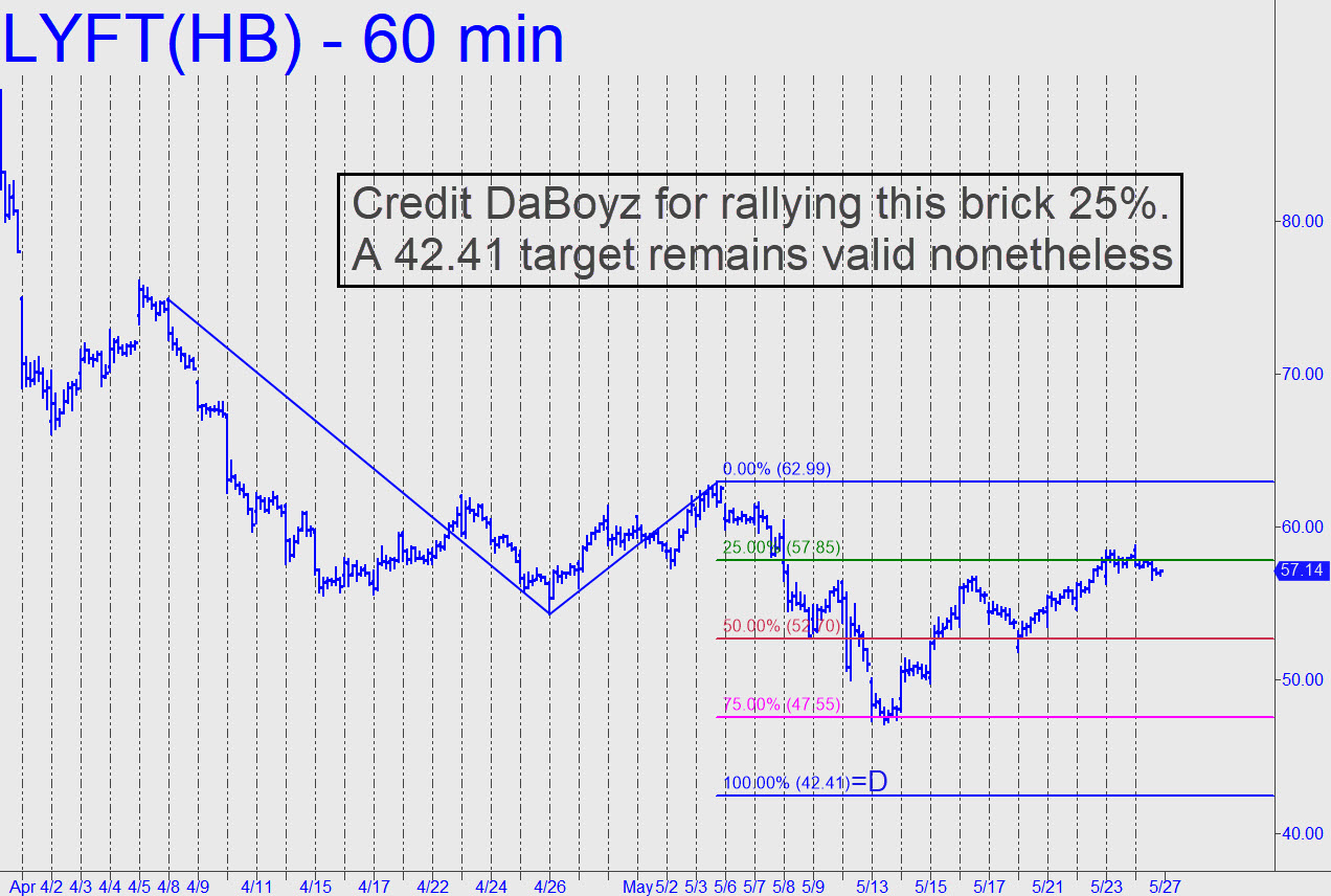 Lyft’s 25% rally off a post-IPO low of 47.17 demonstrates that there really is a sucker born every minute. They evidently have been lining up in droves to purchase shares of Lyft, which at best faces a long, treacherous path to profitability. A key hurdle is whether drivers for the digital ride-sharing companies are to be classified by the IRS as employees rather than contractors. If the former, the firms are fated to get trounced by independent operators banding together to provide all of the services that Lyft and Uber currently provide and a few more. For your information, LYFT triggered an old-style ‘mechanical’ short Thursday at 57.85, stop 62.99, for a shot at 42.41. This is a riskier set-up than we usually trade, so I am advising it only for experienced Pivoteers. ______ UPDATE (Jun 3, 7:18 p.m.) Shorts are getting squeezed hard and would invalidate the 42.41 target if 62.99 is exceeded. That would not change my bearish outlook for the stock, although we would need to establish a new short position at a higher level. _______ UPDATE (Jun 5, 5:46 p.m.): Short-covering drove this gas-bag slightly above 62.99. Now, we can use the 62.99 peak recorded on May 3 to short the stock ‘counterintuitively’. If it goes no higher than Wednesday’s 63.24 top, the short would be signaled at 59.29._______ UPDATE (Jun 9, 6:15 p.m.): A two-day plunge triggered the short at 59.29 for a presumptive ride down to at least 55.33. I will track the position if I hear from at least two subscribers who did the trade._______ UPDATE (June 10, 5:04 p.m.): The ‘counterintuitive’ short is showing a $1000 theoretical profit at the moment on 400 shares. It has the potential to produce an additional $550 at p=55.33, and nearly $1600 more at D. I’ve heard from just one person who did the trade. Any others? In any case, half should be covered near 55.33. ______ UPDATE (June 11, 2:50 p.m.) Cover half the position here, around 57.80, and use a 58.61 stop-loss for the rest. It should be worked o-c-o with orders to cover an additional 25% at 57.35, and the final 25% near 55.44. _______ UPDATE (Jun 13, 5:06 p.m): A 400-share position would have produced a gain of $554 if you followed my instructions exactly. You covered 200 shares at 57.80 for a $288 gain; 100 shares (6/12 on the opening) at 57.35 for a $188 gain; and the last 100 shares at 58.61 for a $68 gain. Have a good last look, since it could be a while before the stock turns up on this list again.