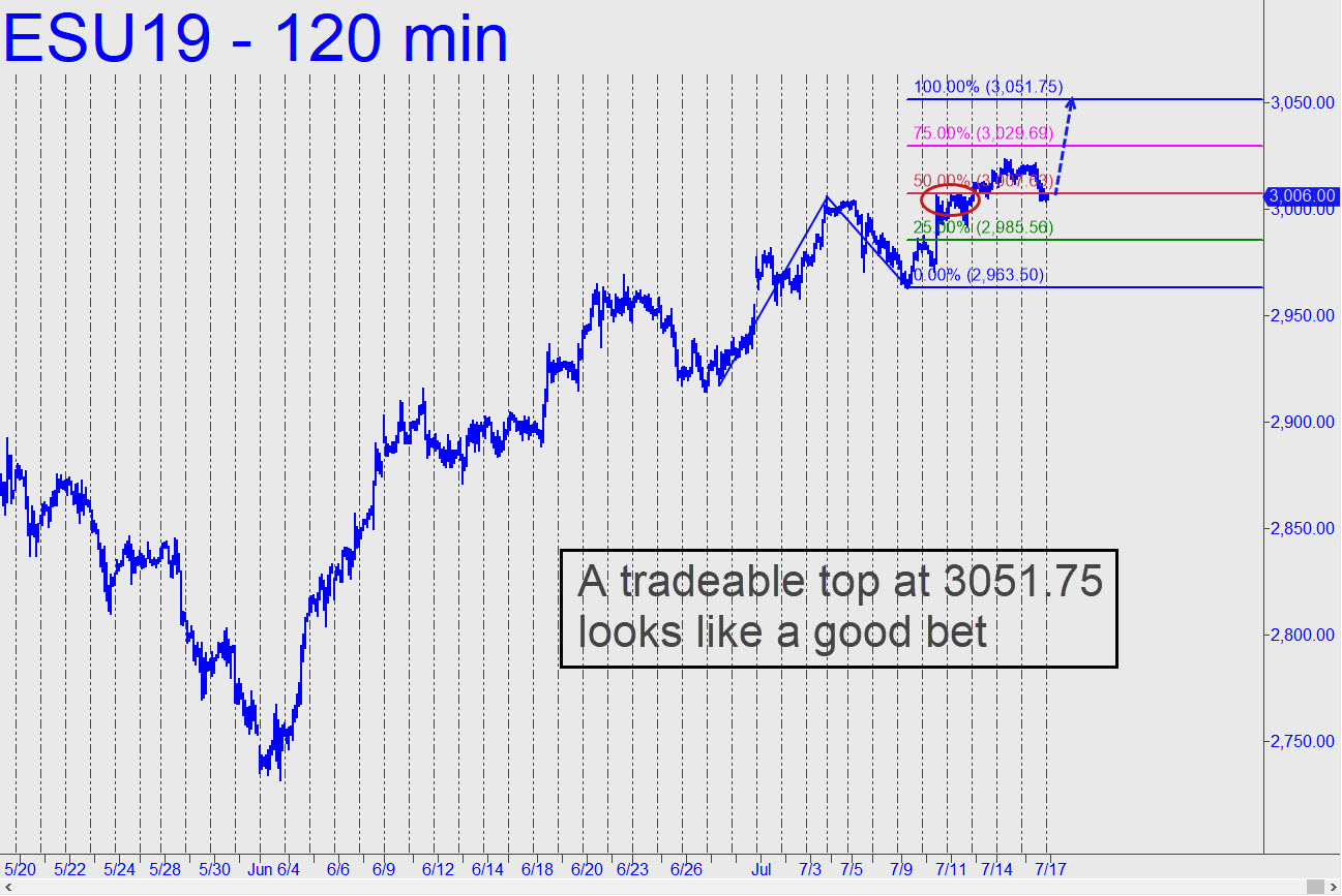 I have significantly higher targets outstanding, but for trading purposes and to get a precise handle on the near-term, I’d suggest focusing on the relatively minor Hidden Pivot at 3051.75 shown in the inset. The pattern could set up two trading opportunities: a mechanical buy on a pullback to the green line (2985.50, stop 2963.25); and a short from 3051.75, stop 3053.25. We’ll consider a ‘reverse’ (rABC) for the second trade if and when 3051.75 is reached, but it would require a small pattern created at the presumptive tail-end of the rally to provide a good entry signal. Tune to the chat room for further guidance in real time if you care. _______ UPDATE (Jul 17, 8:07 p.m. ET): The mechanical trade triggered at 2989.50 and carries theoretical risk per contract of $1100. If two or more subscribers are aboard and let me know in the chat room, I’ll establish a tracking position. Half of the position should be exited at 3007.63, worked o-c-o with the stop-loss. _______ UPDATE (Jul 18, 5:47 p.m.): The ‘mechanical’ trade advised above triggered in the final moments of Wednesday’s session and is showing a theoretical gain of $900 per contract at the moment. The futures are at 3003.50, slightly shy of the midpoint pivot at 3007.63 where I’d suggested exiting half. However, you should do so now, cashing out 75% of the original position in order to nail down a nice gain. Assuming one contract remains from an original four, use the 3051.75 target to exit, making your offer one-cancels-other with a stop-loss at 2963.25. If the trade concludes as planned, the total profit on the position would be $6000. Several subscribers reported doing the trade. Please keep me apprised in the Trading Room.______ UPDATE (6:06 p.m): Moments after I sent out that last update, the futures upticked above 3007.63 (to 3008.75 so far), mooting my advice. Officially I will record the exit on three contracts at 3003.50. In practice, however, anyone who followed my original guidance would have made an additional $200 per contract. The remaining contract (or 25% of the original position) should still be held for a shot at 3051.75, using the stop-loss advised._______ UPDATE (Jul 19, 9:47 a.m.): Raise the stop loss on the remaining 25% of the position to 2971.00, o-c-o with a closing offer at 3047.00.