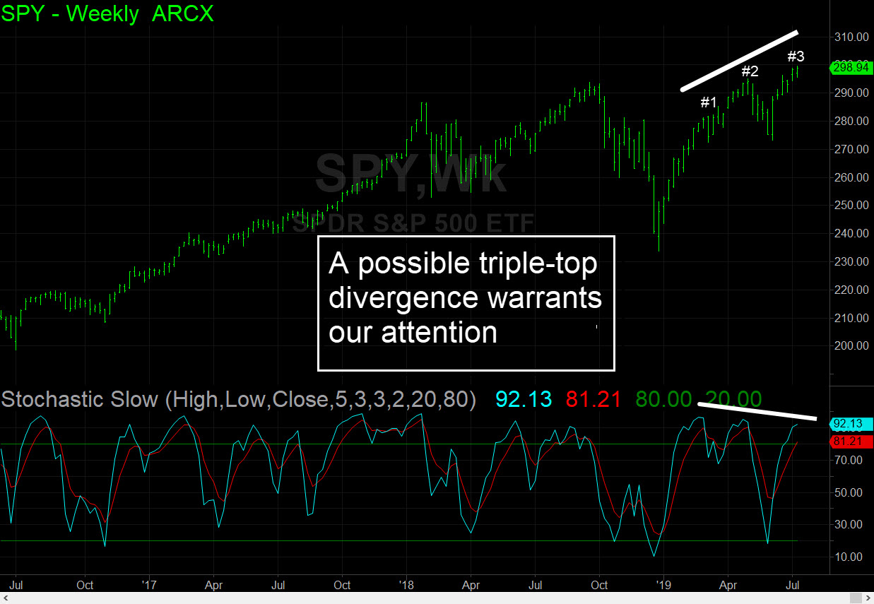 We won’t know for at least another 2-3 weeks which is about to occur, but because a third diverging peak could have such dire implications, the chart is worth monitoring closely. _______ UPDATE (Jul 14): Friday’s close at the very top of last week’s price bar diminished the odds of a bearish stochastic divergence like the one described above. Another strong close this week and the chart would look much less threatening.