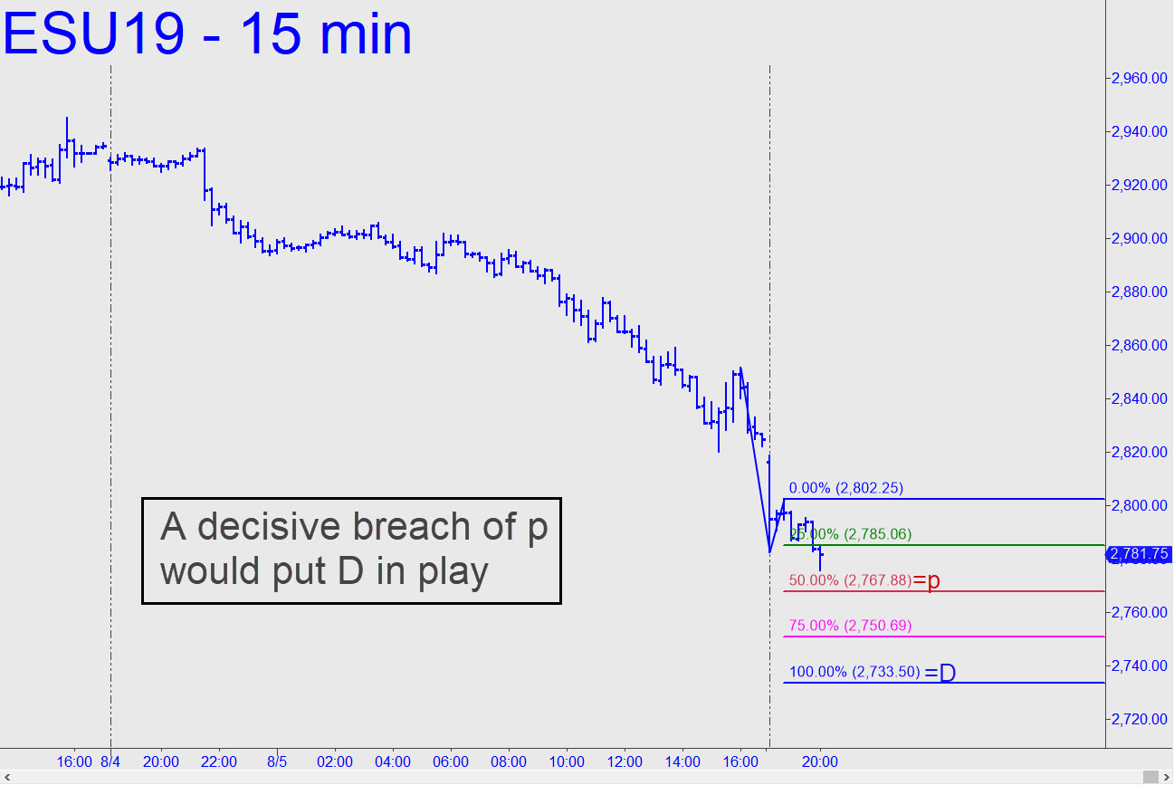 Today’s 110-point drop can be a little intimidating, but an ABC pattern is an ABC pattern, and its magnitude should have no bearing on our ability to target the move. (Recall the scene in Hoosiers when Gene Hackman measured the distance from the basketball court floor to the rim and found it to be 10 feet, even though the court itself was in a 10,000 seat arena.) Anyway, we should look for the selloff to continue to at least p=2767.88, but a breach would portend more slippage to as low as 2733.50 over the near term. ‘Mechanical’ and countertrend trades will perforce be riskier than usual in dollar terms, but the rules for executing them are the same. _______ UPDATE (Aug 6, 10:06 p.m.): DaBoyz recouped a third of the futures’ recent losses with the help of some urgent short-covering. Keep in mind that nothing has changed to mitigate the tariff war, only that China has finally placed a bid under the yuan, setting off a bear-squeeze panic in the dead of night. Shorts are the only buyers here, so we’ll stand aside and let them shoot holes in their feet with semiautomatic weapons.