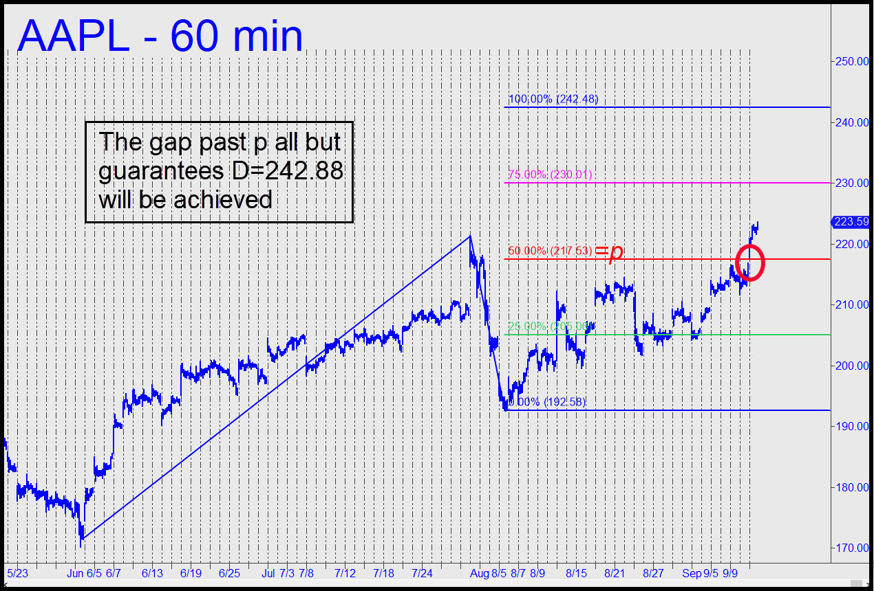 And gold bulls as well. A resurgent bull market is certain to put bullion and mining shares under pressure, interrupting the powerful rally begun late in May. They have held up well so far and on Tuesday even gained some ground with the Dow up 227 points. This is a very bullish sign, and it provide reason to think the precious metals sector will hang tough if there’s a blowoff coming in the stock market. However, if you plan to buy bullion aggressively, you may get better prices by waiting for 2-3 weeks. ______ UPDATE (Sep 17, 6:17 p.m.): My immediate outlook is still quite bullish, but we are monitoring the stock’s vital signs closely because of the drubbing it took last week. This chart shows a rally pattern smaller than the one projecting to 242.48, with a feeble uptrend that has triggered a theoretical buy signal at x=220.33 and minimum implied upside to p=223.65. If AAPL is going to get to 242.48, or even to the 230.27 target of the smaller pattern, it will need to push past 223.65 with little strain. _______ UPDATE (Sep 19, 5:34 p.m.): No surprise here: The rally reversed from 223.76, just 11 cents from the Hidden Pivot resistance I’d noted above. If as expected AAPL blows past, look for a further run-up to at least 230.27. You can short there aggressively if you’ve caught a profitable piece of the ride north. _______ UPDATE (Sep 22, 12:04 p.m.): The 223.76 target I’d provided above came within 11 cents of nailing last week’s high. A $6 selloff ensued, but there were no reports in the Trading Room of anyone having used the target to get short. We’ll back away for now, since it’s anyone’s guess where AAPL’s canny handlers will take it next. The 242.48 rally target remains viable nonetheless. _______ UPDATE (Oct 3, 8:43 p.m.): Just one small change: a slight upward revision in the target to 243.68. One of the coordinates used to determine the original target was a hair off.