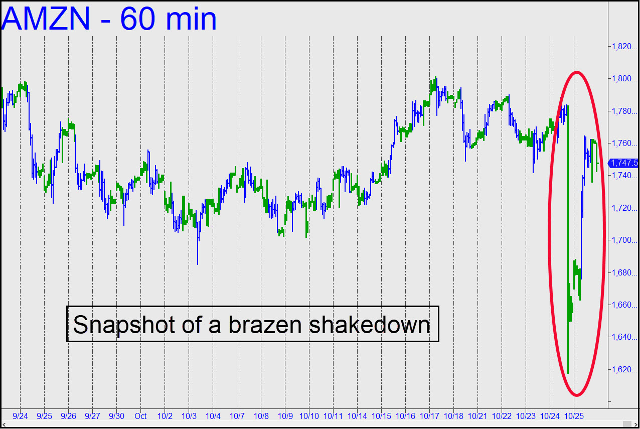 One could not ask for a more vivid picture of sleazeballs at work than the AMZN chart accompanying this tout. Thursday’s melodramatic swoon recalled Oscar Wilde’s quip, “One must have a heart of stone to read the death of little Nell without laughing.” And so it was with Amazon; for only an imbecile could have regarded the stock’s swift, 165-point dive as bearish. News out after the close fretted about the impact on Q3 earnings of Amazon’s aggressive efforts to ramp up one-day deliveries. Cutthroat play is exactly how the accompany has come to dominate the retail landscape, and plowing revenues back into operations rather than bringing them down to the bottom line is how Jeff Bezos rolls — how he got to be the richest man in the world.