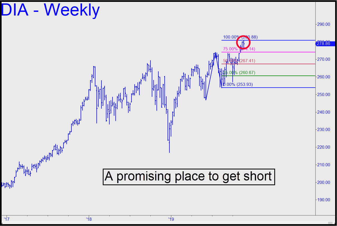 A target at 280.88 allowed us to get short four cents off what could prove to be an important top. An initial position of eight Nov 22 280 puts has yielded a partial profit that effectively reduced the cost basis for the two puts that remained to a $200 CREDIT. Because the options expired on Friday, I suggested rolling the position forward by buying two Nov 29 280 calls while letting the two puts we were long turn into short stock. This effectively gave us two synthetic put options that will provide further gains if DIA continues to fall while limiting our losses if the Dow recovers next week. The $140 we paid for the calls is more than offset by the $400 in theoretical profits booked on the sale of six puts from the original position.