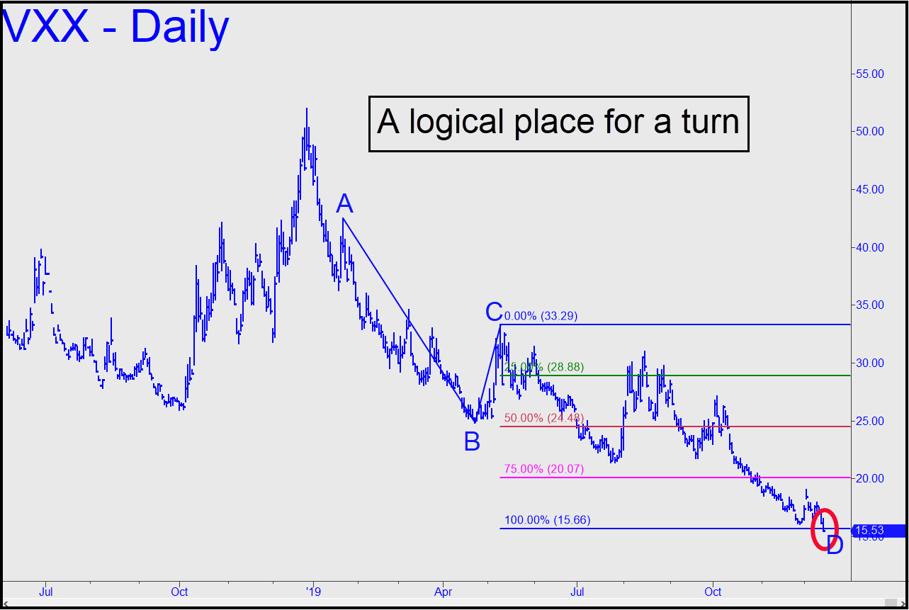 Looking at stocks from a technical standpoint, the most potent ammo I’d possessed to throw at bulls last week was a longstanding target at 15.66 in VXX (see chart, above), a trading vehicle that tracks short-term S&P volatility. The target was hit on Friday after a horrific slide from 27 begun just two months ago. VXX moves lower when stocks rally, and both trends stood to reverse when VXX hit a major low. Although I’d be surprised if a tradeable reversal fails to materialize, I now expect it to be muted. I’m not quite ready to throw in the towel, though, and it’s possible Friday’s 15.51 low will turn out to have signaled a major top for the stock market. We’ll wait and see how things develop in the days ahead, but we shouldn’t count too heavily on making money on the VXX calls we bought Friday. _______ UPDATE (Dec 16, 10:33 a.m. EST): I have in fact thrown in the towel. The next target seems surreal: 9.92. Here’s the chart. If it’s achieved, the Dow will be trading w-a-a-a-y above 30,000. There’s an illuminating discussion in the Trading Room at the moment concerning how this popular trading vehicle is run as a quasi-criminal enterprise.