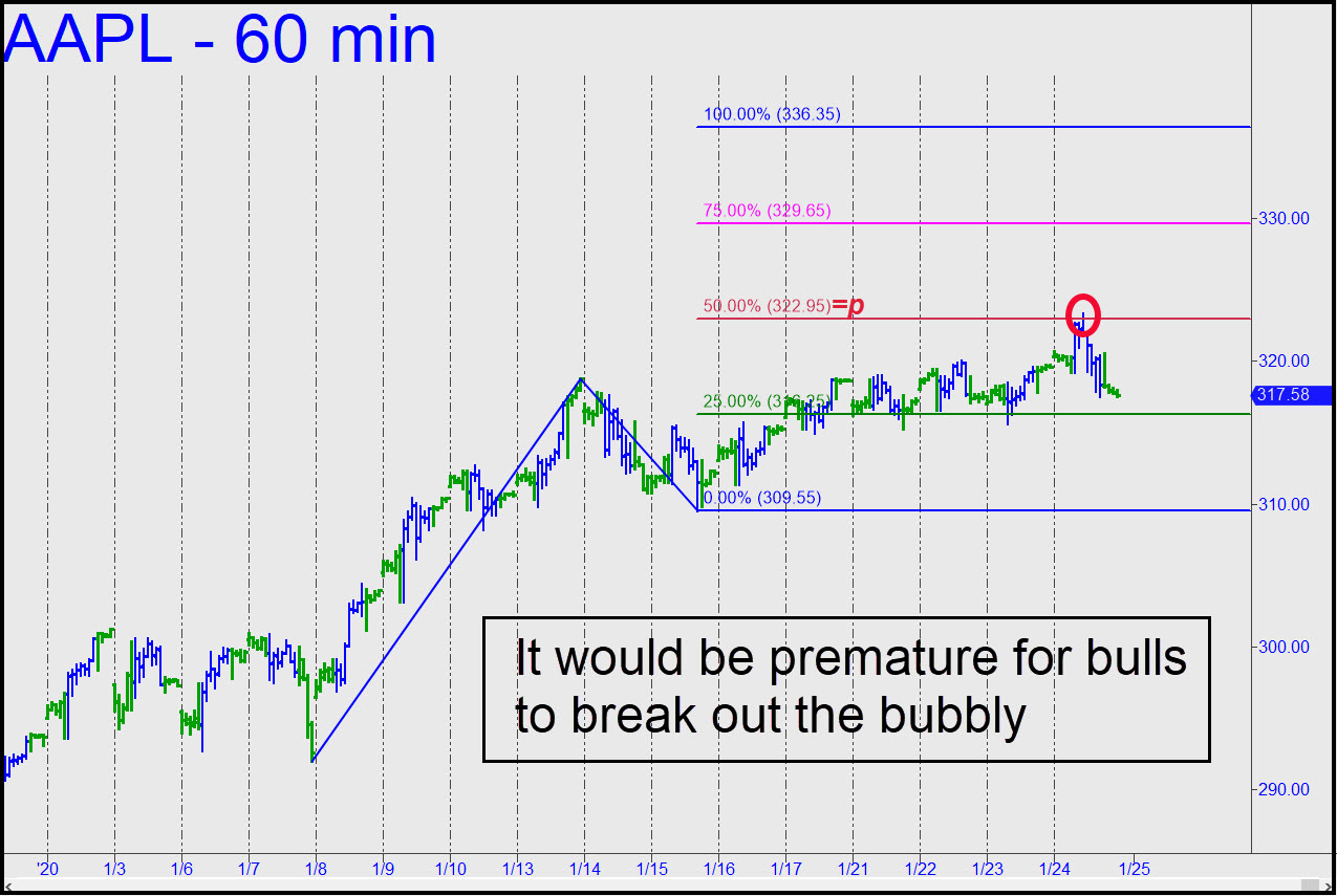 I would caution bulls against breaking out the bubbly merely because this gas-bag finally exceeded my 319.92 target after ten days of trying. In the first place, I’d stipulated that AAPL must close above that Hidden Pivot resistance for two consecutive days before we regard the 336.35 target as an odds-on bet. For two, Friday’s stall and $6 relapse began almost precisely at the 323.95 midpoint Hidden Pivot shown. That’s the most likely place for a trend failure to occur, and so the yellow flag is out, tempering our expectations of a surefire move to 336.35. The pattern can still be used to trade the stock either bullishly or bearishly, but please note that AAPL would NOT become a mechanical buy on a pullback to x=316.25 because the C-D rally died well short of our sweet spot for this type of trade. _______ UPDATE (Jan 27, 9:42 p.m.): I’m tracking 20 June 250 puts @ 3.05 for a subscriber who used my 319.92 target to get short. I’ve recommended shorting 20 June 245 puts against them for $3.55, but you can go as low as 3.35, where they topped on Monday, if you please.