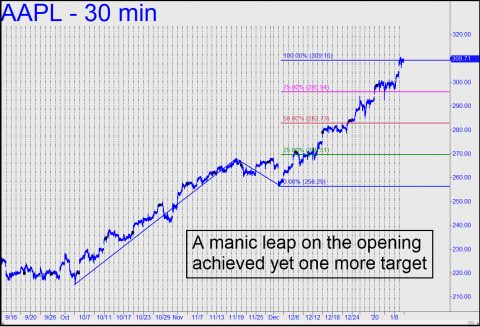 Paying close attention to AAPL is still the best way to know exactly what’s on the tiny brains of portfolio managers. Lately they have been acting as though the company can do no wrong. That’s arguable, but even if they are mistaken it doesn’t mean we should get in the stock’s way. To the contrary, numerous Rick’s Picks subscribers reported cashing out of profitable bullish positions that had been predicated on a run-up to at least 309.16. The stock hit that Hidden Pivot Thursday on a manic short-squeeze leap at the opening, then spent the rest of the day doing the hokey-pokey with it. There is however yet another target slightly above, at 314.28, and I’ll be more than a little surprised if AAPL simply blows past it. It comes from a clear and compelling ABCD pattern that is shown in the chart accompanying the AAPL tout below. (I’ve made this graph publicly available so that non-subscribers can see the enlarged version by clicking on it.) I have continued to emphasize the importance of getting Apple right, because as long as the company’s shares are moving higher, the broad averages cannot but move with it. That being the case, we should pay close attention to price action when — not if — the stock hits my benchmark. If this happen in the final 15 or so minutes of Friday’s session, I’ll be taking home a few cheap puts over the weekend, since you never know.