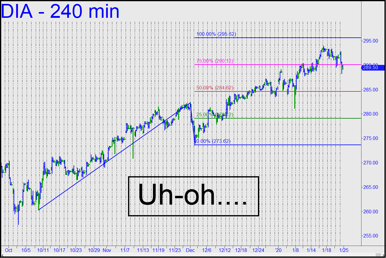 Friday’s punitive reversal occurred from a high recorded several days earlier that missed a crystal-clear target I’d flagged at 295.62 by a mile. Although the target remains valid in theory, it seems more likely that the selloff will gain momentum this week, generating an impulse leg on the daily chart. That would require a print below 287.84, a threshold that will probably be achieved on Monday’s opening if index futures have opened weak Sunday night. The bearish impulse leg would be no more powerful than the one in early December that gave rise to a powerful rally, but this time it would be occurring in a more critical place — i.e., visibly short of an important target that had the potential to cap the bull cycle begun in October. Regardless, bulls should brace for a fall to at least p=284.62 before they venture forth again. That would trigger a long-shot ‘mechanical’ buy in theory, but we would take the trade only with risk very tightly controlled, if at all. ______ UPDATE (Jan 27, 10:07 p.m. EST): Sellers overshot p=284.62 (see above) by 0.76 points, implying they are not spent. The impulse leg would grow in power if further weakness on Tuesday exceeds 283.56. _______ UPDATE (Jan 28, 9:08 p.m.): DIA leapt higher at the bell and never looked back. In retrospect, p=284.62 now looks like a ‘mechanical’ buying opportunity foregone. Bulls have a tough climb ahead nonetheless if they are going to reach the 295.62 target that was missed by a foot on January 17, when the Dow notched a record high. _______ UPDATE (Feb 1, 10:57 p.m.): A tough climb indeed! DIA reversed sharply from well shy of the 295.62 target identified above and now appears headed down to at least 280.08. Bottom-fish there with a small-pattern rABC pattern, but be prepared for the worst, since the coronavirus scare is waxing. _______ UPDATE (Feb 3, 9:53 p.m.): Like the E-Mini S&Ps, which we also tried to buy, DIA turned sharply from a Nowheresville low between p2 and D=280.08. The rally may have seemed powerful, but it actually fell well shy of the 289.29 print it would take to turn the hourly chart bullishly impulsive.