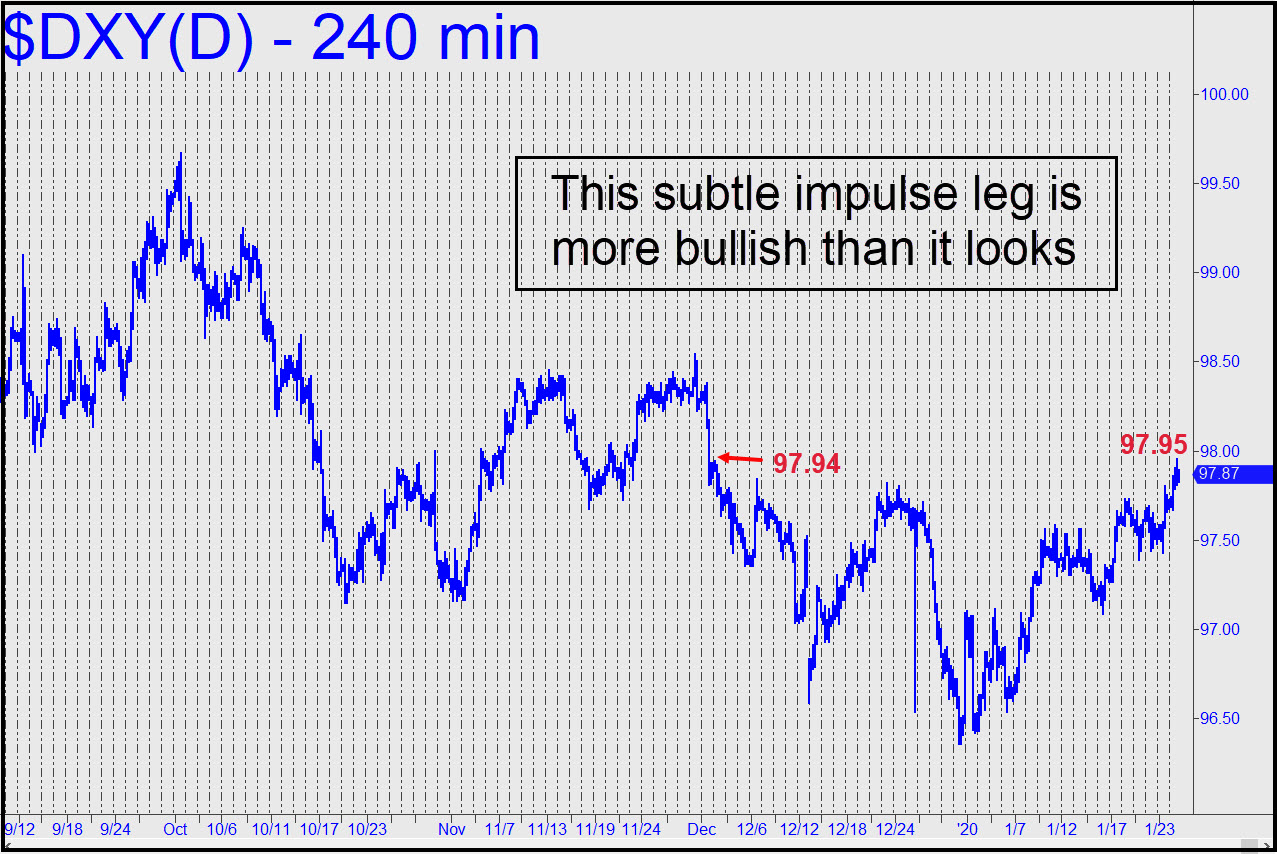 Three months after bottoming an inch from a well-advertised Hidden Pivot target at 96.40, the Dollar Index has generated its first bullish impulse leg on the 240-minute chart. This was accomplished with great subtlety, since DXY exceeded the requisite external peak I’d identified by just a penny. That’s all it took, though, to transform the balky rally of the last three weeks into a promising new start for the greenback. Now, any retracement that stays above 96.36 will be presumed corrective and therefore a buy. It remains to be seen how much pressure a waxing dollar will put on bullion, but as a chat room denizen noted, gold more than held its own when the dollar rallied sharply in the June-October period. _______ UPDATE (Jan 27, 10:05 p.m.): A Hidden Pivot resistance at 98.13 is a logical place for a short-term top. ________ UPDATE (Jan 28, 9:04 p.m. EST): DXY dropped 0.22 points after peaking at 98.16, just three cents above my target. Let’s see how long the top holds. _______ UPDATE (Feb 1, 10:49 p.m.): The selloff from within pennies of the 98.13 target I’d flagged continues to lengthen, but support should come in around 97.10. Let’s see how it fares. _______ UPDATE (Feb 4, 9:57 p.m.): The dollar got traction at 97.37, well above the support I’d flagged above. This is mildly bullish, but DXY will needed to take out the old high at 98.19 to generate some excitement. _______ UPDATE (Feb 5, 9:56 p.m.): The dollar easily cracked the 98.19 resistance. Now, if it blows past the 98.47 target shown in this chart, it would imply bulls are still rarin’ to go. ______ UPDATE (Feb 6, 9:00 p.m.): DXY easily pierced the 98.47 ‘hidden’ resistance, implying that still higher prices are coming. ________ UPDATE (Feb 10, 9:37 p.m.): The rally is approaching a Hidden Pivot resistance at 98.86 that looks likely to show some stopping power. Let’s see how bulls handle it before we assess the further potential of the uptrend. _______ UPDATE (Feb 11, 8:36 p.m.): Buyers have pushed the Dollar Index to within an inch of a potentially important rally target at 99.00 that remains viable. The target has been adjusted slightly upward to correct an error. Here’s the chart.