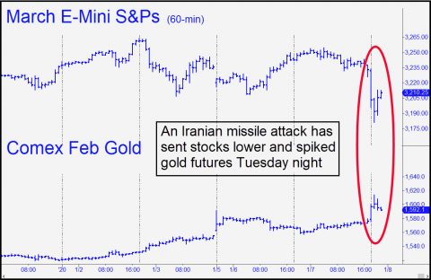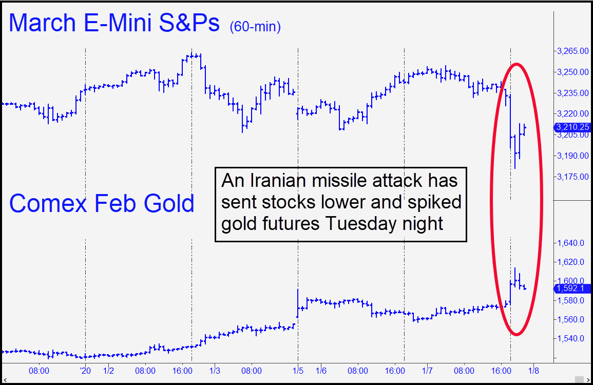 Stocks are getting pummeled Tuesday night following an Iranian missile attack on a U.S. military base in Iraq. Index futures are down more sharply than they would have been if the story had broken during the regular session. But with the second- and third-stringers working the trade desks and an absence of liquidity, they had no choice but to let stocks fall as steeply as possible without having to buy too much of it on the way down. Whether the attack turns out to be the start of World War III remains to be determined, but my hunch is that traders will take the optimistic view and reverse the onslaught shortly.