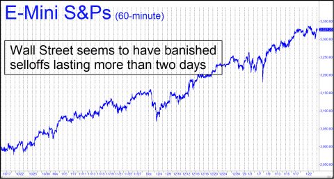 The buy-the-dips mentality has become so entrenched over the last few months that it’s hard to imagine what could possibly derail the bull market. Wall Street feigned mild concern for a few hours over the spread of a deadly virus in China, but absent news that Americans are keeling over dead from it in their back yards, we can expect the broad averages to forge higher. The uptrend has been so relentless that it has come to practically guarantee a quick return for any investor who jumps aboard on a given day. In no instance during the last three months has any bull suffered a third straight day of losses. A strategy as simple as buying the S&Ps whenever they are trading lower for a second consecutive day has been a spectacular winner.