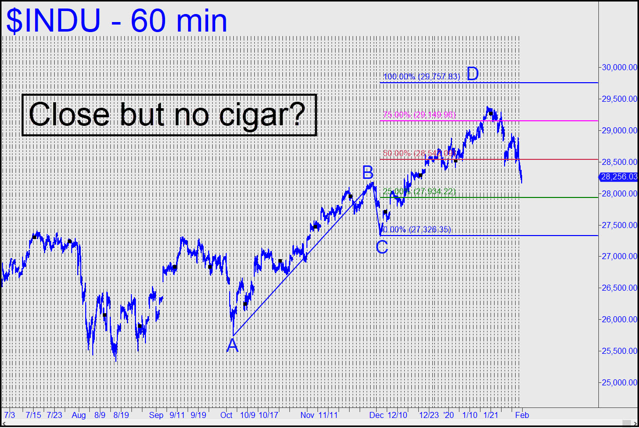 From a technical standpoint, it is troubling that the Dow’s seemingly invincible rally sputtered out without having reached the 29,757 target shown in the chart. This is close enough to the milestone number 30,000 that it should be considered magnetic. A case of ‘close but no cigar’? Wall Street would be forever shamed if the greatest bull market of them all were to die just inches from so obvious and compelling a target. It will remain viable nonetheless unless the pattern’s point ‘C’ low, 27,326, is exceeded to the downside. I should also mention that, under the rules of our trading system, the Dow would trigger a ‘mechanical’ buy at 27,934, stop 27,326. This would be a scary place to jump in, but that’s what the ‘mechanical’ set-up — one of five that we use to get long or short — was designed to handle. We won’t presume to know how things will turn out this week, but our inclination would be to sell into strength as long as the virus story appears to be waxing.