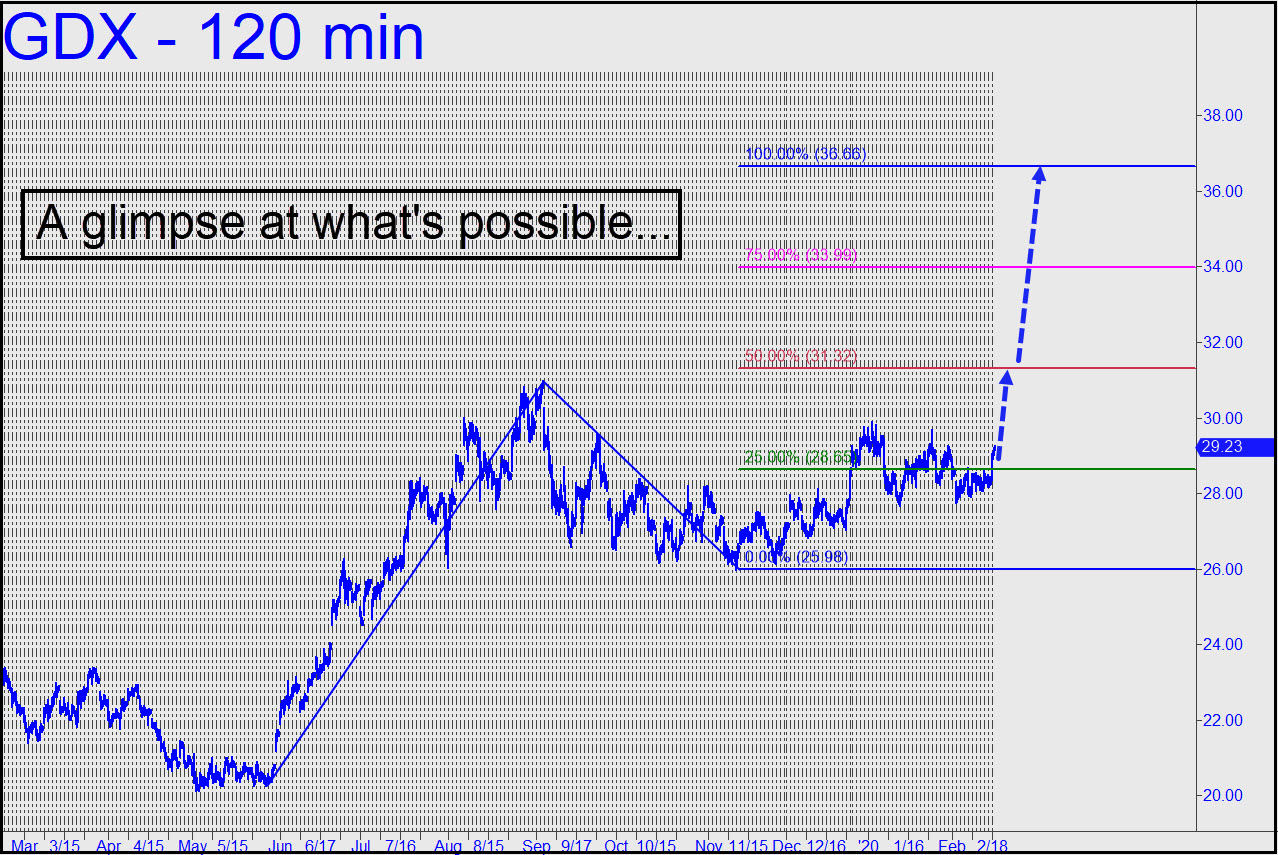 On February 2, based on reports from subscribers, I established a tracking position of 400 shares @ 28.39. I am still suggesting that you exit half at 29.42, but we’ll keep the remainder for a shot at much higher prices (see chart inset). If GDX eventually reaches the 36.66 target, we could book a profit of as much as $1,886. It could take a while, but we’ve already proven we can endure a brutal grind waiting to collect our first payoff. It is not yet in the bag, though, since the stock was still 27 cents shy of the 29.42 profit target at today’s high. Fortunately, the uptrend looks sufficiently robust to get us there on Wednesday.
