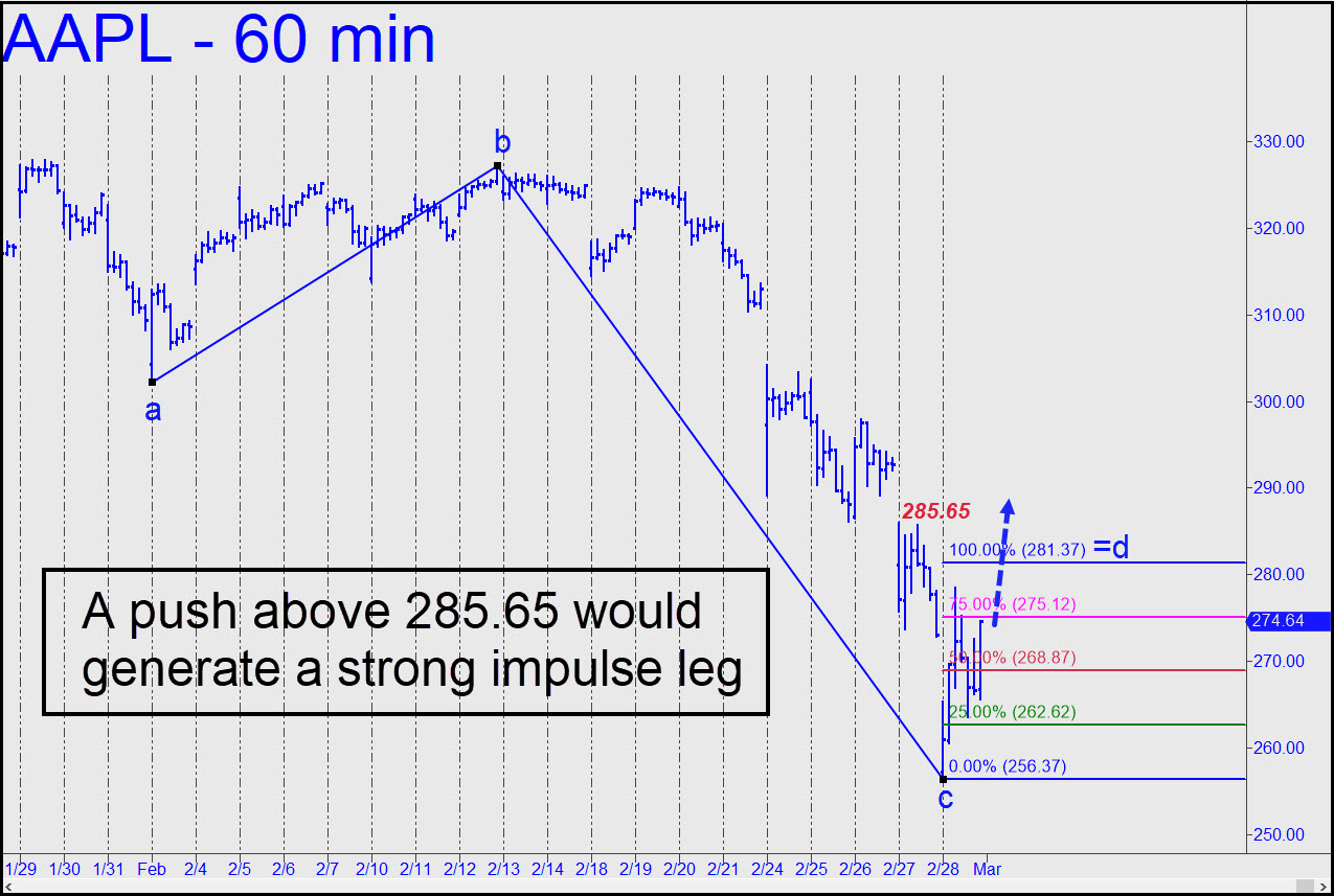 AAPL bounced a spectacular $22 off a low that occurred $2 from the 254 target we’d used to try and nail the bottom of the so-far mini-bear market. That wasn’t quite close enough to get long with one of the trick-shot set-ups we use, although it may have helped timing an exit from any puts you held for the ride south. Looking just ahead, we can use the 281.37 target of the rABC pattern shown as a minimum upside objective, but the stock would need to push past 285.65 to generate a strong impulse leg on the hourly chart. The trick for us now will be to avoid underestimating the power of this short squeeze, which will feed on the tendency of fools to do exactly that. _______ UPDATE (Mar 2, 10:32 p.m. EST): The world’s smartest money is up to its beady little eyeballs in Apple stock, so shorts don’t have a prayer. It’s going to be ‘Take no prisoners!’ all the way up, and the goal will be to jack the stock high enough so that it can attract a new crop of institutional suckers who will think they’re getting a bargain on even mild weakness above $300.