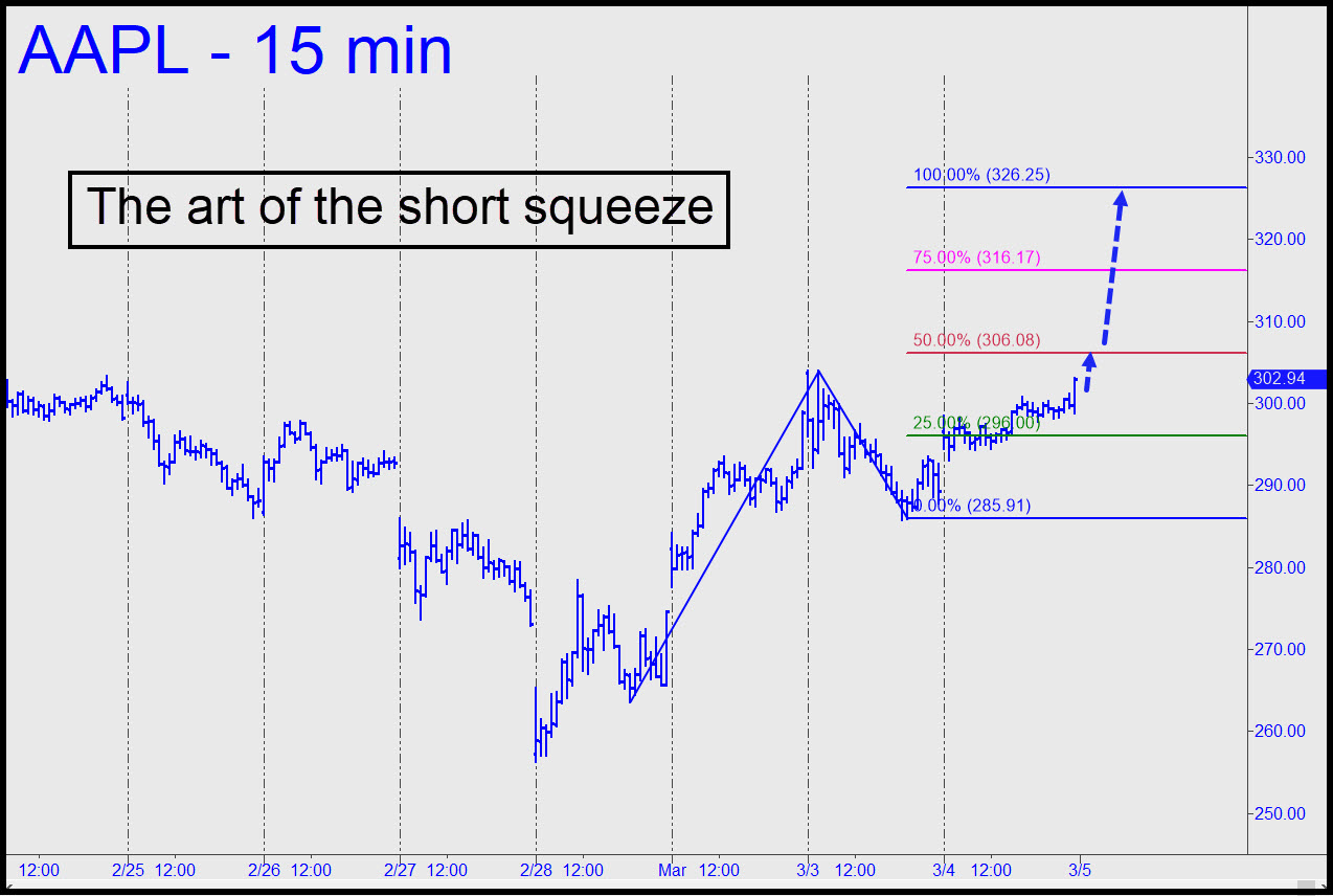 If AAPL gets within $10 to $15 of the record high $328 achieved on January 29, it will be as though the company’s revenue warning never happened. Even better for big players seeking to lighten their load, once AAPL seems comfortable above $300, many institutional investors who have been eager to buy the stock or augment their holdings will think they are getting a bargain when it pulls back for a day or two. With these things in mind, we shouldn’t disdain the possibility that AAPL could achieve new highs. If it does, expect the rally to drag the broad averages along with it. Thus will DaBoyz have leveraged a single stock to resurrect a bull market that many gave up for dead at last Friday’s shell-shocked lows. ______ UPDATE (Mar 5, 4:26 p.m. EST): The stock shredded bulls and bears alike on the way down today. Here’s a chart that augurs are more durable bounce from exactly 290.57.