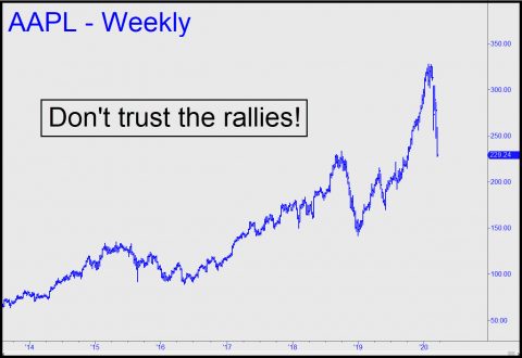 But if you had been glued to the tickertape on Friday, you might have believed AAPL was a tower of strength, since it held in positive territory until the final hour. What telegraphed its day-ending collapse, an unsettling drama that led the entire stock market lower, was DaBoyz’ inability to pad AAPL with sufficient gains to resist late-session selling. It was trading up $2-$3 for much of the day, but that was not quite enough to fool the herd into thinking the market might rise into the closing bell. Instead, still smarting from having bought into last Friday’s run-up, and having come to understand that weekend news concerning the pandemic is still most unlikely to be hopeful, they dumped shares en masse.
