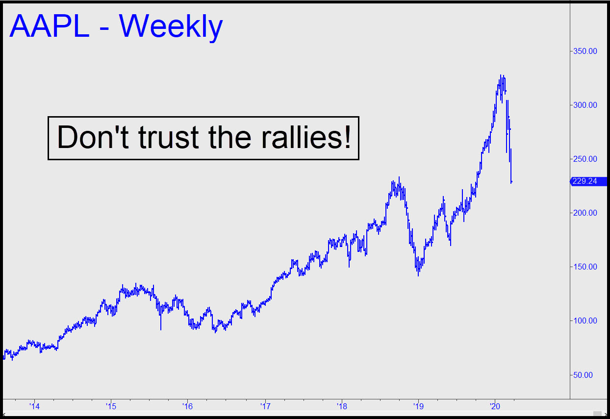 Lately, the delicate task of distributing AAPL shares without frightening the unwary has become one of DaBoyz’ most urgent concerns. The company, by virtue of its enormity, stands to become one of the biggest corporate losers in the world as the pandemic intensifies assembly and distribution problems. The devastating hit to sales will come later, amidst a global recession-or-worse — most particularly in China, iPhone’ second-biggest market. Rick’s Picks had projected minimum downside to $235 when the stock broke below $287 a couple of weeks ago, and we held to that target even when a violent short-squeeze goosed AAPL from $248 to $279 in a day. The stock crashed through $235 on Friday, however, suggesting that lower prices are coming — perhaps much lower (i.e., under $100).