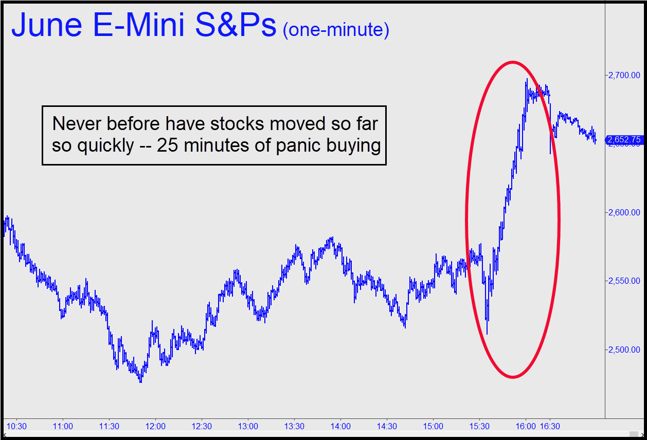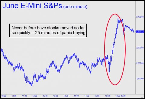 Haywire would be an understatement, for it was the craziest, most volatile week in stock-market history. That’s because machines are doing nearly all of the trading these days, and the algorithms that instruct them are programmed to detect and exploit the stock market’s every cough, sneeze, hiccup or belch before any living thing feels even a slight tremor. It was bad enough when short-covering humans with hair-trigger reflexes could cause stocks to soar for little or no reason. But when ten thousand thinking machines are set against each other to accomplish the same thing, except profitably, the predictable reaction is irrationality on an epic scale. The embarrassing thing — for civilization, that is — is that trillions of real dollars change hands when these melt-ups occur. It is plain to see that the markets are riddled with a fatal neurological disease for which there is no possible cure — other than, perhaps, getting reset by a bolt of lightning.