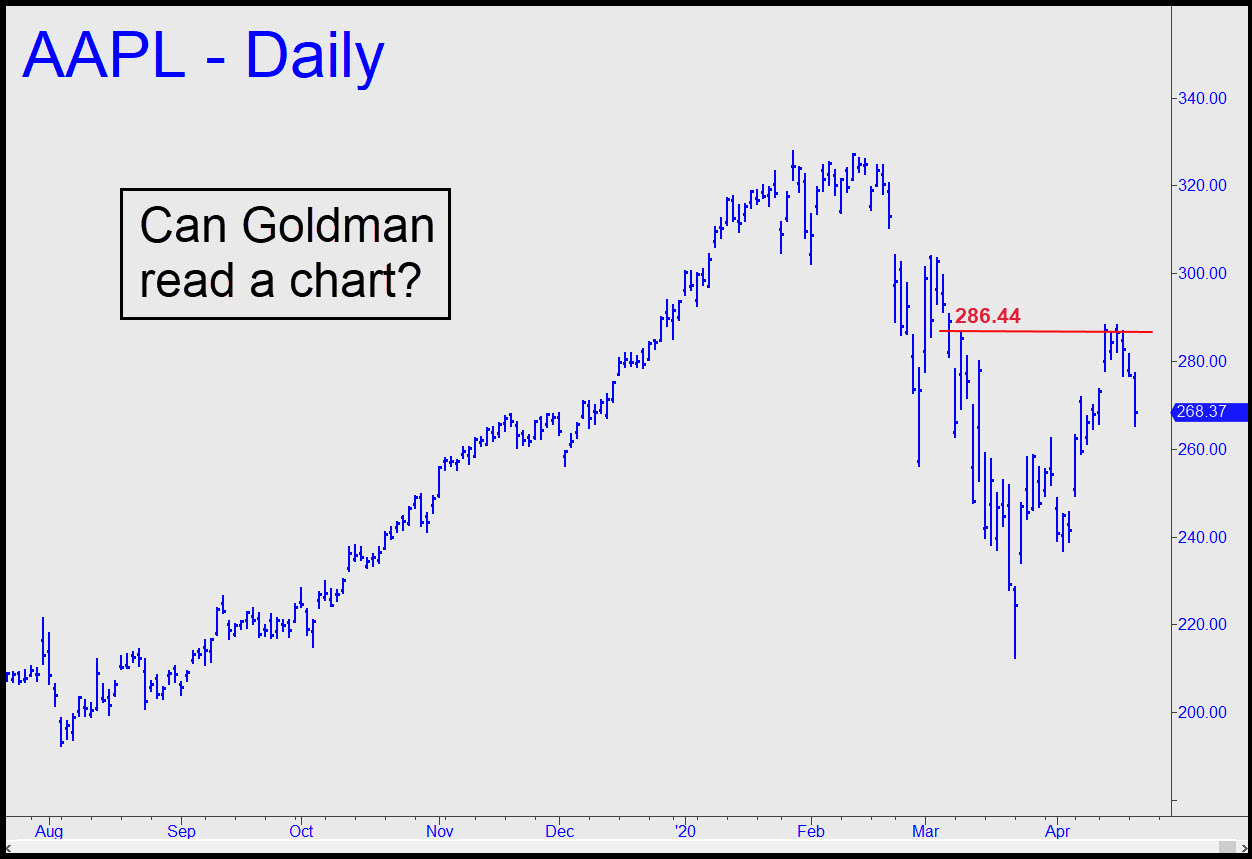 In the Trading Room this morning, a subscriber recalled my certitude recently that AAPL’s bear rally would reach a minimum 313.58 before sputtering out. As it happened, the stock swan-dived 8% after going no higher than 288.25. Should I double down on my target? As far as the subscriber was concerned, Goldman Sachs already won the bet: “Rick,” he texted, “I’m going to give the point to Goldman.” True, the renowned investment firm had presciently waved the yellow flag just ahead of AAPL’s fall. Some would say it was Goldman’s warning itself that caused the stock to plunge, and they would be right. That doesn’t necessarily mean it won’t keep falling. For all we know, Goldman’s vaunted analysts have nailed a very important top. But I doubt it, given the fact that the 288.25 high slightly exceeded an ‘external’ peak at 286.44 recorded a month earlier (see inset). The seemingly failed rally generated a powerful, albeit well camouflaged, impulse leg on the daily chart, implying that the selloff begun Friday is corrective and will eventually give way to a new rally leg. Anyone care to lay me some odds? Incidentally, my long term forecast for AAPL calls for an eventual drop below $100 — an outlook far less sanguine than you will find among self-aggrandizing dartboard prognosticators like Goldman who retail stocks to the public, and whose front-run advisories notoriously lag big moves in either direction. ______ UPDATE (Apr 27, 8:59 p.m. EDT): No, you’re not imagining it, Apple really does face some big problems, including: 1) shifting assembly out of China; 2) maintaining sales of a high-margin product during a global recession/depression, and 3) competing in a streaming market glutted with competitors. Even so, I’ll stick to the bullish targets flagged above. Buyers are struggling with the 285.26 midpoint resistance shown in this chart, but once decisively above it they’ll have a clear path to at least 305.08. _______ UPDATE (Apr 29, 10:25 p.m.): This morning’s short-squeeze gap through the 285.26 resistance demonstrated beyond doubt that Buffett and DaBoyz are firmly in control of the stock. So successful have they been in maneuvering it higher in order to unload their holdings on The Stupid Money that they must be surprised themselves by the rabid ferocity of the short-covering panic that has made this possible. Look for more upside most immediately to p2=295.17, and thence to D=305.08 if any higher. Here’s the chart.
