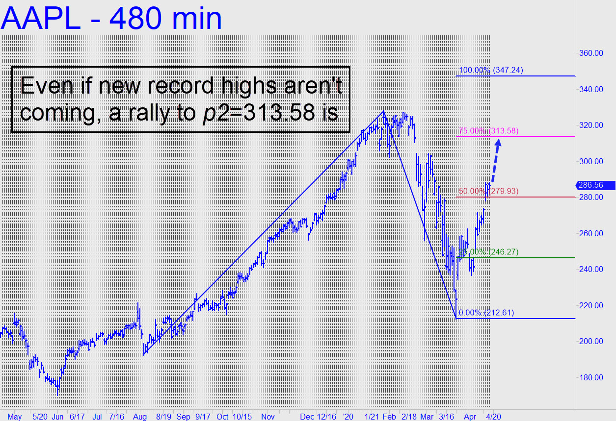 The hopeful, decisive pose struck by the President during tonight’s briefing has touched off a spirited short-covering rally, powering this dervish past a major Hidden Pivot resistance at 291.45 that I hadn’t expected to give way so easily. Actually, I’d planned to get short there, but fortunately the gap-up move in after-hours trading rendered my bold dream impossible. The move has opened a path to p2=313.58, a well-wrought secondary pivot shown in the chart. It will likely be a better place to try shorting than tonight’s erstwhile Maginot Line; however, when we are doing so, it would be careless to ignore the magnetic allure of D=347.24. At that price AAPL would be in record territory, as blithely oblivious to the realities of pandemic economics as a tin of sardines. ______ UPDATE (Apr 20, 12:20 .m.): Goldman’s spinmeisters unloaded on AAPL Friday, driving the stock sharply lower. Although the selloff generated a bearish impulse leg on the hourly chart that merits our attention, I still expect a rally to at least 313.58 before a top is in. ______ UPDATE (Apr 21, 12:08): If bulls are about to regain command, we should see AAPL turn from either 275.20 or 272.61. Both of these Hidden Pivot supports are shown in this chart. ______ UPDATE (Apr 21, 9:22 a.m.): Sellers breached 272.61 shortly after dawn and now AAPL will fall to at least 268.38, a target calculated using night bars. For the moment, however, Buffett and DaBoyz are using bears like a speed bag, sending the stock into a short-covering rally before they let the stock grope its way down to a ‘natural’ low. Here’s the chart, with a 268.82 target that is derived from overnight bars.