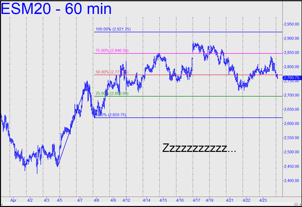 After two weeks of meaningless ups and downs, stocks seem in need of instruction. Or inspiration. Or something. It will likely come in the form of a headline, but don’t expect the news to be anything special, or even interesting. Bulls/bears are ready to seize on just about any item that the news media could pretend or claim is significant. Thursday’s morning’s headline in the WSJ concerned a private equity deal for Victoria’s Secret, a bra-and-panty has-been, and for all we know, the reported souring of the deal was the cause of the stock market’s rally in the first hour. Regardless, my aging, bullish target at 2921.75 remains theoretically viable. I won’t pretend I’m as enthused about it as I was two weeks ago when it emerged, but it’s all I’ve got to offer you at the moment. A whopping, 145-point decline would invalidate it, but little else save Armageddon.