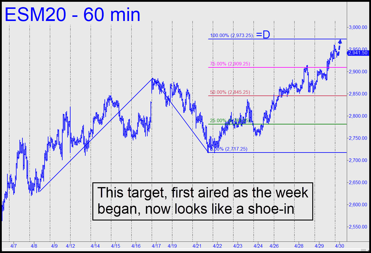 By closing well above a clear Hidden Pivot resistance at 2921.75 given here earlier, the futures all but clinched a further push to at least 2973.25. I am recommending shorting there only if, guided by my insanely bullish targets, you’ve banked at least $1000 of profits on the way up. I expect a tradeable pullback from 2973.25, but this should not be regarded as low-hanging fruit. I say this because there are so many bears in the Rick’s Picks Trading Room who have been salivating over the possibility that this psychotic short-squeeze rally, the most powerful ever witnessed in U.S. markets, is nearing an end. Such skepticism is what has in fact propelled it, and it is far more widespread than just the chat room. Rest assured that as long as there even a few bears still standing, the craziness will continue. Above 2973.25, I would suggest putting aside Hidden Pivot targets and substituting the obvious benchmarks that the mouth-breathers will be focused on: 3000, and thence 3121, where the futures made an important top in early March on the way down. There is also a ‘magic number’ at 2997.00 that, although not a resistance, meets criteria that I have been experimenting with for the last couple of months. _______ UPDATE (Apr 30, 9:04 a.m. EDT): The futures have pulled back sharply from a wee-hours, short-squeeze peak at 2965.00. A missed tally target, especially one so clear as this one, should always be taken as a sign of weakness, notwithstanding the fact that in this case, it revealed itself in the context of a world-beating rally. Think of it as Garbo’s ominous cough in the second reel of Camille. It certainly did deny us an opportunity to get short on our terms. Oh well.