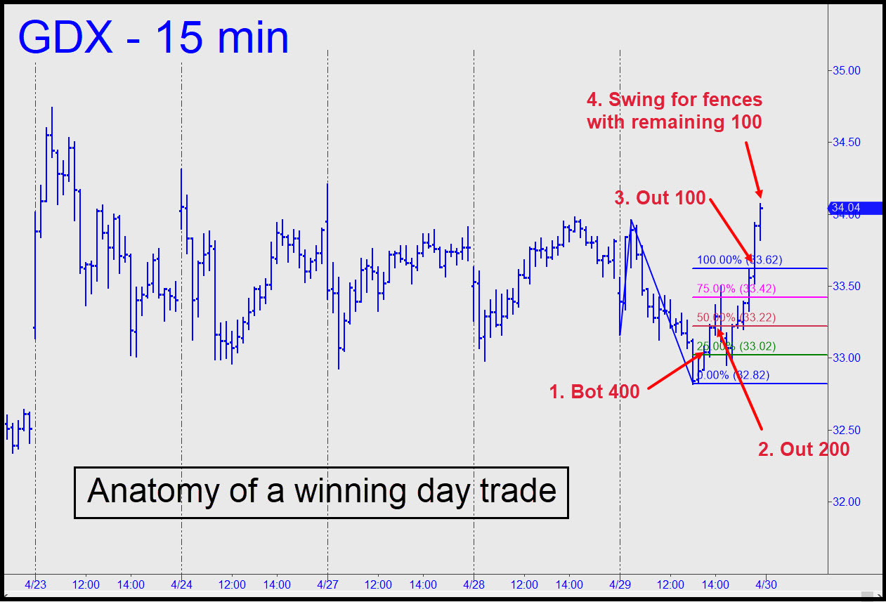 A trade posted in the chat room at 1:52 p.m. was showing a $182 gain at the bell, with 75% of it exited. Its purpose was twofold: 1) to provide a low-risk, low-cost ‘starter’ position in a popular gold vehicle; and 2) to show the many subscribers who have recently signed on how they can profit and have fun doing it by tuning to the chat room. On both counts, this gambit was a success, since GDX took off toward the end of the session. Here’s the recommendation that went out initially. Judge for yourself whether you could have done it: “If [the stock] has gone no lower than 32.82, buy-stop [yourself into] 400 shares at 33.02. Place a stop-loss on all of it at 32.81, worked against an o-c-o order to exit 200 shares at 33.20. This will be a ‘starter’ long position.” Many subscribers reported doing the trade as directed. Looking ahead, we’ll shoot for the fences — in this case a ‘D’ target at 38.01 (30-min, A=29.55 on 4/21). Stay tuned for possible adjustments, however, since we may do a covered write with call options if and when GDX hits the first significant resistance enroute to the target, a midpoint Hidden Pivot at 35.42. That will be my minimum upside objective if the stock closes above x=34.12 for two consecutive days. If you’d rather take the money and run, by all means do so at will. Rest assured, there will be other similar opportunities down the road. _______ UPDATE (Apr 30, 12:40 p.m. EDT): My bad, since I drifted off to sleep last night intending to put a stop-loss on the position. This morning was so hectic that I barely gave GDX a thought. Exit now, around 32.58, since the stock has stopped being fun for the time being. We can re-enter at will, but realize that, once I have gotten you into a profitable position, you will always have discretion to do with it as you please. The profit on this one, assuming a 32.58 exit, would be around $30. Lunch money. We can look forward to the next time, but with the recognition that catching a durable low in this little sonofabitch is going to be a pretty good trick.