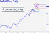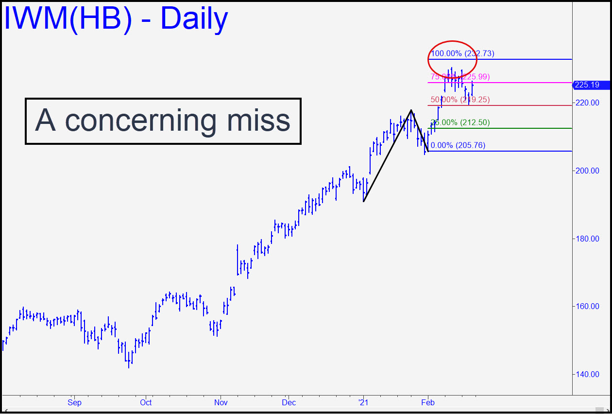 IWM’s recent failure to achieve either of two rally targets I’d drum-rolled is curious, given that it has been the vehicle of choice for portfolio chimps paid to throw other people’s money at superficially appealing ‘themes’. The more important of the targets is 234.82, derived from a pattern that stretches back to the beginning of the bull market in 2009. The other is the 232.72 target shown in the inset. It’s possible the chimps, abetted by their unwitting slaves, short-covering bears, will lay waste to the two Hidden Pivot obstacles in the week(s) ahead. For now, though, we can infer only that Big Money has stalled, presumably waiting for bears to provide the kind of boost that mere bullish buying cannot. Given the targeted tops that have occurred recently in the Dow, QQQ and S&Ps, the burden of proof will be on the optimists as the week begins. ______ UPDATE (Feb 24, 7:25 p.m.): The lunatic brigades were back, bolstered by short covering that drove this gas bag to within easy distance of 234.82. Right now, that’s the only place I’m recommending getting short. _______ UPDATE (Feb 25, 6:12 p.m. EST): Our chances of getting short at 234.82 further dimmed today, although IWM’s dive has yet to do any serious damage to the intraday charts. Let’s see what Friday brings.