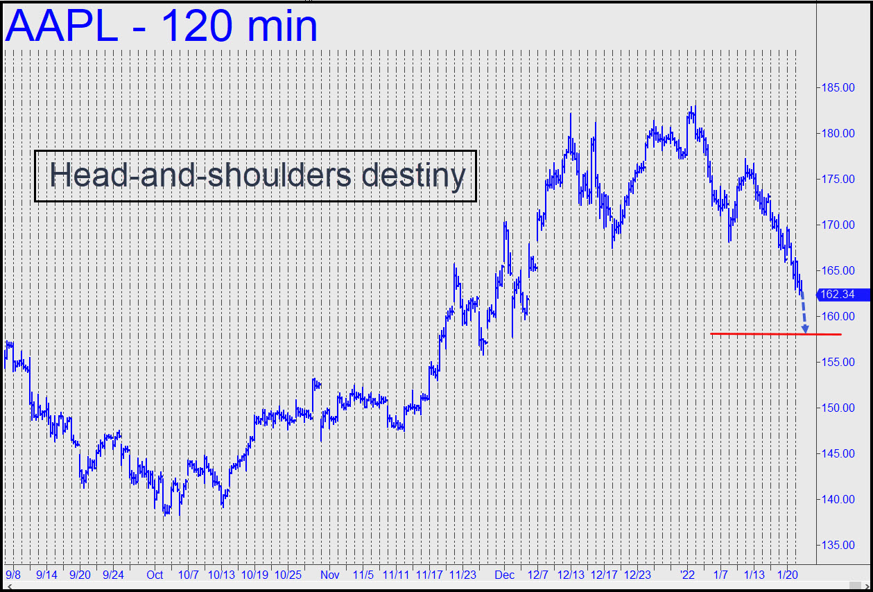 The head-and-shoulders pattern that AAPL has traced out since Thanksgiving is so commanding at this point that there’s no point in using Hidden Pivot patterns to try to improve the forecast. The selloff will need to hit 158 or so to round out the pattern visually, with additional room all the way down to around 147 if bears mean business. We shouldn’t rule out the distant-longshot bet entirely, however. That would call for a sharp reversal from 160 or above that just keeps going. A rally with sticking power would be telegraphed by minor rallies that shred their d targets. Whatever happens, AAPL continues to be the perfect proxy for institutional mindset, ambition, folly and greed. _______ UPDATE (Jan 24, 8:23 p.m.): Today’s exhilarating plunge to 154.70 made the head-and-shoulders pattern look even more compelling. It amounts to mountainous supply, so we’ll focus on ways to get short, or perhaps long in order to make a few bucks ahead of the next downturn. Stay tuned to the chat room for a timelier perspective.