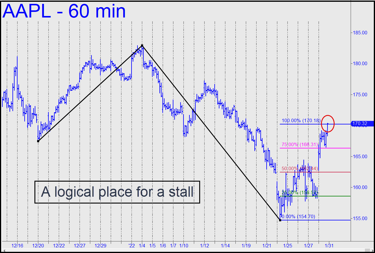 AAPL stalled almost to-the-penny at 170.18, the D target of the reverse pattern shown. We might have attempted to get short there if this had occurred in the middle of the day. However, it was not such an appealing play ahead of the weekend, especially with the stock closing on the high tick of the session. The rally to the target in retrospect was all but ordained, given the gap-up opening bar through the midpoint Hidden Pivot at 162.20. The spike also exceeded an external peak from a week ago, generating the kind of impulse leg that almost invariably portends a continuation of the trend. Elsewhere on the page, I’ve featured a chart that shows the stock rallying to the neckline of a bearish head-and-shoulders pattern. Which picture will prevail? The questions seems likely to be settled this week, since just sitting there is not an option. _______ UPDATE (Jan 31, 8:12 p.m. EST): DaBoyz showed the trading world’s hard-core doubters of the bull’s invincibility how it’s done, effortlessly wafting a $3 trillion stock more than 2% higher on a volume-less Monday morning opening. Just a few more points and their perennially resurgent Phoenix will have the magnetic help of the old record-high at 182 to add imagination’s pull to short-covering’s push. ______ UPDATE (Feb 2, 8:47 p.m.): DaBoyz are about to let AAPL fall, since the carnage in Facebook and Paypal has made it unnecessary and uneconomical to support King Kong when lower ‘reload’ prices are guaranteed.