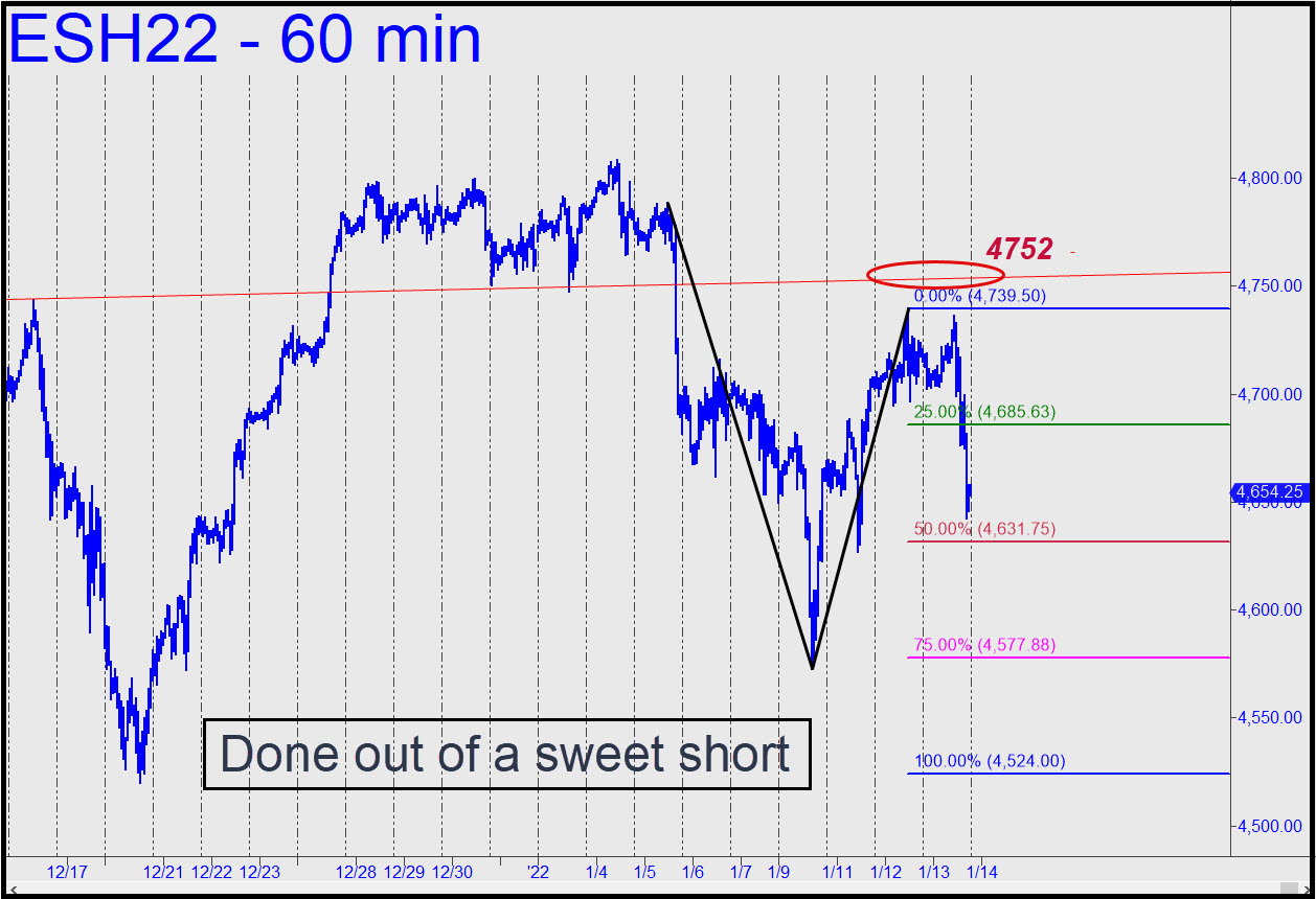 The supply-and-demand logic of the chart shown predicts a potentially important top at 4752.00. This is not a Hidden Pivot resistance, but rather a price along a trendline that explains itself. The very gentle slope of the line is determined by two peaks where anyone who bought got crushed by what happened next. All of these losers have been praying for the last month or so to get out ‘even’, and they may just get their wish. But I doubt they’ll come away with much of a profit, since there’s a dome of copious supply just above the line (which can be shorted with a stop-loss as tight as you can handle.) There is no way buyers will get past the trendline on the first try, and if their efforts continue for a few more weeks, that would eventually create a head-and-shoulders pattern. It would require perhaps 20-25 days to accomplish this, assuming the right shoulder develops with the symmetry common to H&S formations. The foregoing doesn’t negate the 4907.75 bull-market target I’ve been drum-rolling here for quite a while, but it does give us a more modest objective that could prevent an important downturn from somewhere shy of 4907.75 from catching us unawares. _______ UPDATE (Jan 13, 6:43 p.m.): We got chumped out of an enticing short when buyers failed to push this hoax up to the trendline. The line seems too eclectic to have been front-run, but we’ll never know for sure. There’s still tons of resistance there in any event, so we’ll have to figure out another way to get short if and when the futures rally back up to the line. In the meantime, I expect a tradeable bounce from very close to p=4631.75 in this chart to confirm the pattern and its 4524.00 downside target. Let’s see how sellers interact with these ‘hidden’ supports before we try to determine whether bears are starting a major offensive. _______ UPDATE (Jan 14, 8:46 a.m.): Sellers have trashed p=4631.75 this morning ahead of the opening, implying weakness is growing. Still, don’t underestimate DaBoyz, who are running the same scam they use every day in AAPL — i.e., taking index futures down to a low where sellers have exhausted themselves before or shortly after the regular session begins. The short-squeeze bounce this tactic is likely to create in the first half of the session should be shorted, albeit carefully. Whatever happens as the week draws to a close, I very strongly doubt that DaSleazeballs will be able to fake buoyancy when stocks resume trading on Sunday evening.