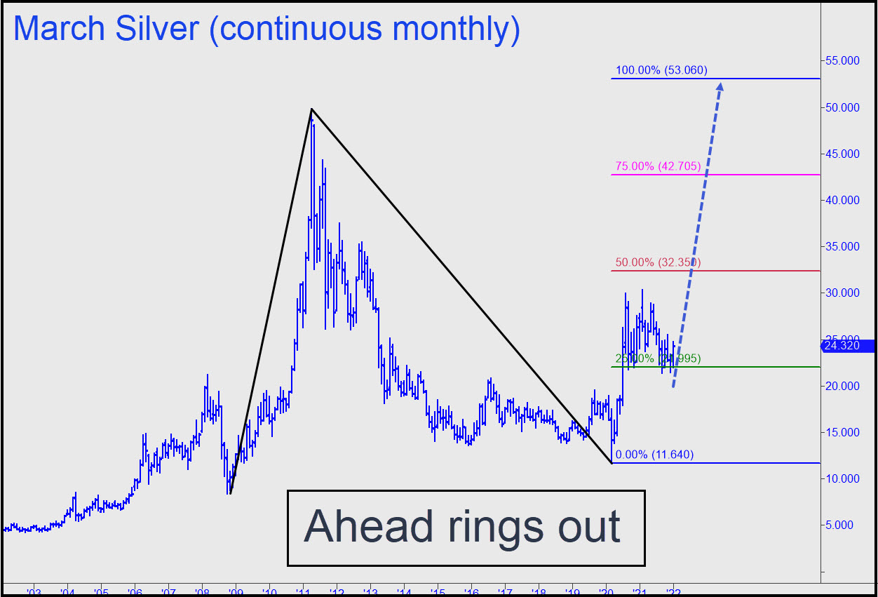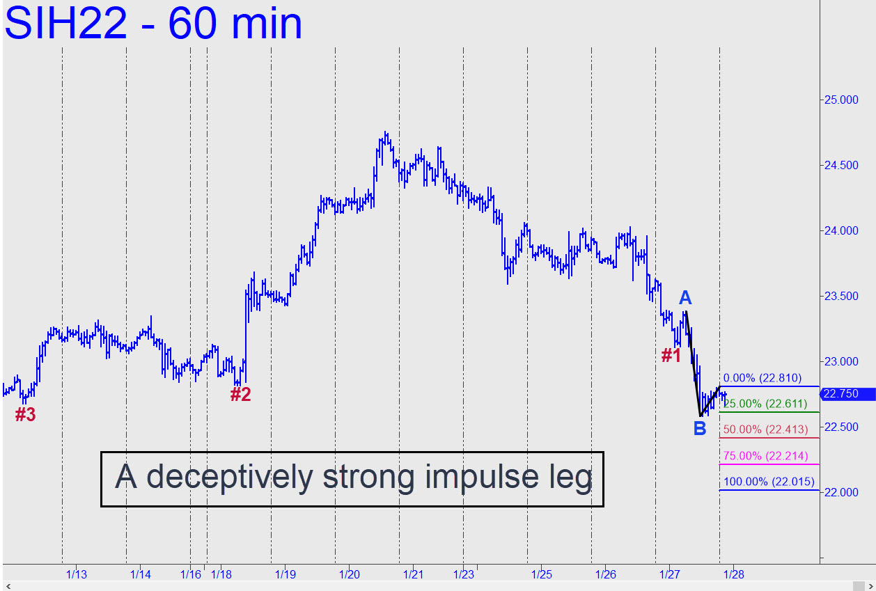 Silver demolished an important Hidden Pivot resistance at 24.01 with such force on Friday that we shouldn’t hesitate to consider far more ambitious targets. The one shown at 40.12 is not even the most optimistic on the horizon; that lies at 53.06, the target of a pattern begun from 8.77 more than 13 years ago. We’ll be better able to judge the power behind the move when we’ve seen how it interacts with the smaller ABCD’s 30.76 midpoint pivot. Another lies at 32.35, and it is likely to be even more challenging, since it is the midpoint pivot of the much larger pattern. The lower midpoint is not in play yet, since it will require a rally to the green line (x=26.09) to lock in the recent low at 21.41 as the pattern’s point ‘C’; however, the big pattern has already done so. In any event, and as you can see, both patterns have very steep impulse legs pushing the rally. That is coiled power, and if it is unfelt now, it eventually will be. It also portends bullish ‘mechanical’ set-ups throughout the bull market that are extremely likely to work. Stay tuned! ______ UPDATE (Jan 24, 8:40 p.m.): My extravagant rally targets (see above) tapped a gusher of bullish sentiment in the chat room today. That’s all well and good, but please keep in mind that the March contract will need to get past November’s 24.58 peak and then some before we break out the bubbly. Last week’s exuberant, Hidden-Pivot-demolishing spike was a welcome and encouraging step in that direction, but no more. ______ UPDATE (Jan 26, 9:27 p.m.): The futures will fall to at least D=23.01 if the secondary support a 23.27 fails. Bottom-fish there only if you know what you’re doing. _______ UPDATE (Jan 27, 8:57 p.m.): Today’s downdraft did significant technical damage, since it exceeded no fewer than three prior lows, two of them external. A drop to D=22.01 looks imminent, but let’s see what develops over the next couple of days to be sure.