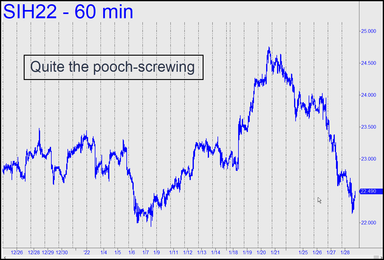 The pattern shown is a civilizational embarrassment, proof that the markets, far from being prescient or even rational, are just a cosmic circle jerk with no real purpose. I won’t dignify or otherwise comment on this chart, since it would be akin to predicting a cockroach’s next feint as it scuddles across a kitchen floor in search of darkness. Nudge me if something interesting happens. The next move is likely to be up, since bears and those who manipulate silver prices for a living don’t have the guts to take out any important lows.