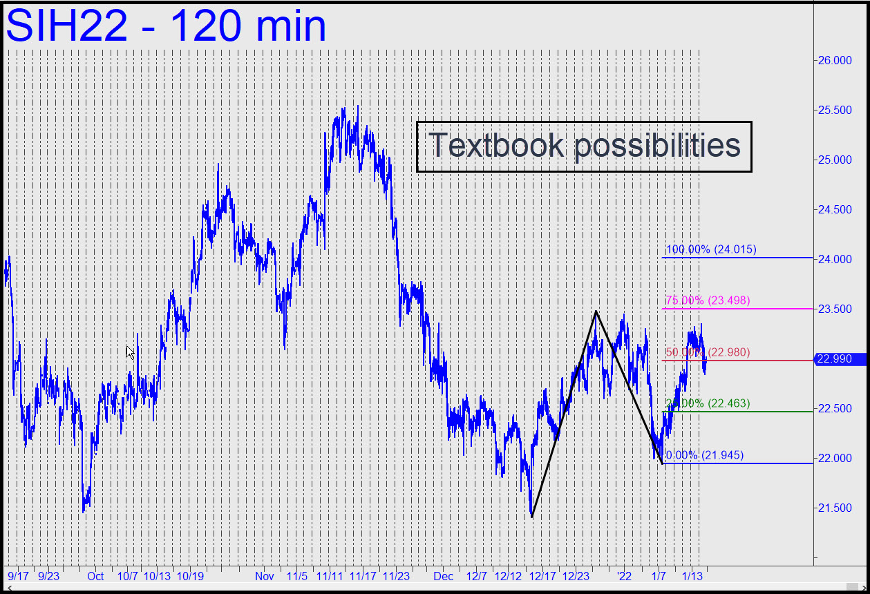 The bull trade explicitly detailed here as last week began could have produced a profit of as much as $9100 with relatively little stress. And here’s more good news: The tradeable pattern has continued to evolve into one that can probably be used successfully again. For starters, a pullback to the green line (x=22.46) would trigger a very appealing mechanical buy. This gambit will work best for those of you who are familiar with camouflage set-ups, since the straight-up risk from a conventional entry would be around $10,000 on four contracts. A short initiated at D=24.01 looks enticing as well, although the obviousness of the pattern could make it a tricky play. The target is a strong bet to be reached, given the way buyers impaled p=22.98 on the first time they came in contract with this ‘hidden’ resistance. ______ UPDATE (Jan 29, 10:50 p.m.): Buyers speared the 24.01 pivot we were using as a minimum upside target, foreshadowing a test of November’s imposing peak at 25.40. A vast void separates the two levels on the chart, creating a a formidable discomfort zone for us to play with. Stay tuned to the chat room if you’re interested.