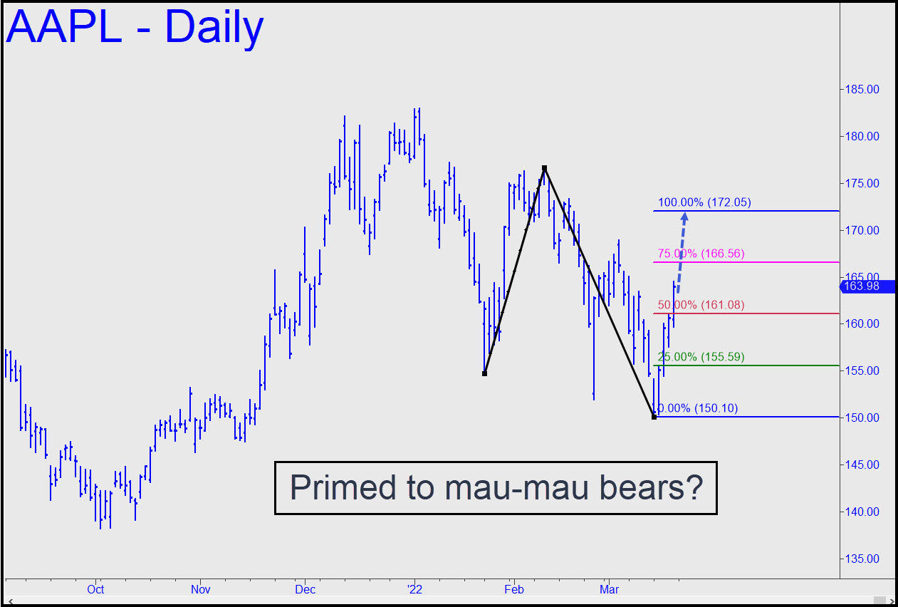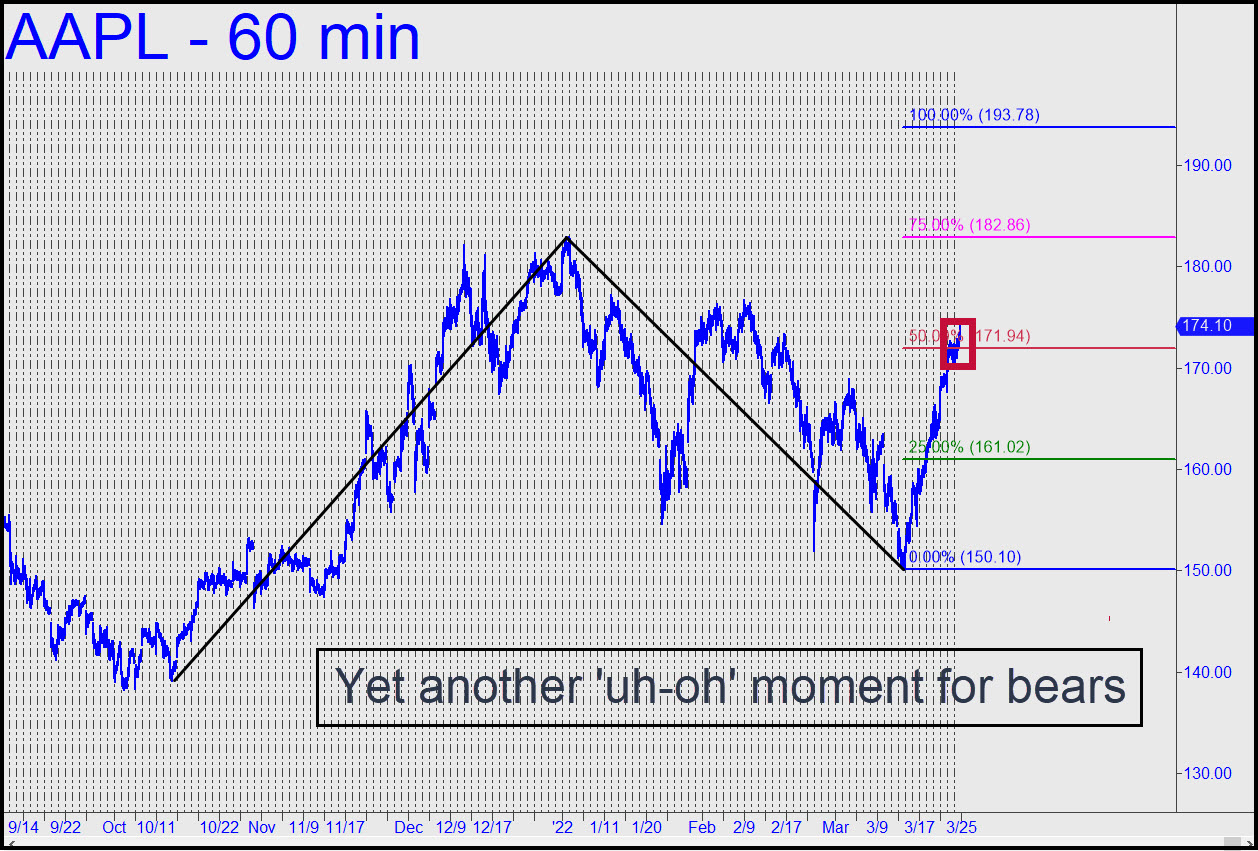 I offer this view of AAPL to complement the menacingly bullish look of last week’s short squeeze in the E-Mini S&Ps. Together, the two charts cannot fail to tell us whether new all-time highs are coming. Although both need more upside to make this bet and D=172.05 a lock-up, AAPL’s thrust through p=161.08 on Friday strongly implies it won’t be a problem getting to at least p2=166.50. That will generate a strong enough impulse leg on the daily chart to put permabears’ fond vision of global ruin in jeopardy. Trade the stock with a bullish bias for now, but you’ll need to tune to the chat room or your email ‘Notifications’ to exploit this lamb chop with Hidden Pivot voodoo. [Note: I have revised my numbers to accord with the chart. I am not sure what planet my brain was on when I typed the original numbers.] _______ UPDATE (Mar 24, 12:59 a.m.): AAPL spent most of the day diddling the 172.05 target before relapsing in the final hour. It took two months to get there, so we should expect a pullback that lasts for more than just a few days. Anything less would be quite bullish, but we’ll let the stock decide this rather than speculate. ______ UPDATE (Mar 24, 10:40 p.m.): AAPL’s take-no-prisoners institutional handlers took all of one day to push the stock past a daunting Hidden Pivot resistance at 172.05, signaling a continuation of the uptrend to at least p2=182.86. I’ve altered the point ‘A’ low, slightly lowering the ‘D’ target to 193.78.