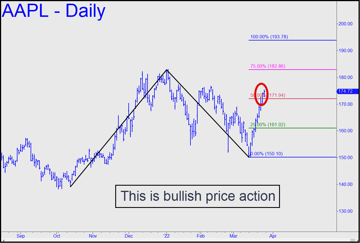 The institutional chimps who went all-in on AAPL 13 year ago can scarcely conceal their giddiness at the ease with which short-covering has been propelling the most bloated-pig-of-a-stock in history steeply higher. Last week they pushed AAPL decisively past p=171.94 in the chart shown, significantly shortening the odds that the squeeze will ultimately produce a new all-time high at 193.78. This is a more bullish picture than the one I’ve proffered for the E-Mini S&Ps, but it is AAPL we should watch, since it is the stock singularly responsible for making portfolio managers look like geniuses and for buttering their bread. A swoon to the green line, however unlikely, should not be regarded as the resumption of a bear market presumed by many to have begun on January 4, but as a fabulous buying opportunity. _______ UPDATE (Mar 29, 11:17 p.m.): The secondary (p2) pivot at 182.86 shown in the chart (inset) can be used as a minimum rally projection for now. It can also be used to get short with a tight ‘camouflage’ set-up. _______ UPDATE (Mar 31, 6:27): Today’s selloff was another fake. DaBoyz will pull their bids for a day or two, then reload at lower levels. The only thing to notice is that Wednesday’s stab higher blew past p2=176.65 and two daunting ‘external’ peaks made, respectively, at 176.65 (2/9) and 177.18 (1/12). That is quite bullish.