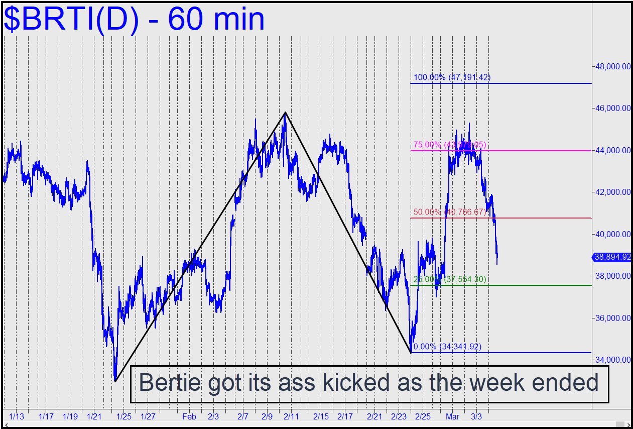 Some serious selling in the cryptos kicked in Friday afternoon after the stock market, evidently tired of falling, had shifted into idle ahead of the weekend. Was Bertie perhaps smart enough to discount the possibility that the Ukraine crisis would not improve over the weekend? Or maybe it was simply concerned that Kamala Harris, by all evidence the most brainless person ever to hold high office in the U.S., was America’s point-man in Europe? Whatever the case, for all the terror last week’s mau-mauing of crypto bulls may have caused, Bertie would still be a no-brainer ‘mechanical’ buy if the plunge continues on Monday to the green line (x=37,554). This one is for experts only, but you can still tune to the appropriate thread in the chat room for guidance. Lately, however, this vehicle seems to be attracting little attention in the room. ______ UPDATE (Mar 7, 8:14 p.m.): The trade triggered, but so what? Subscribers seem not to care even slightly, but I’ll leave Bertie on the list, at least for a while, in case visitors come to the site expecting to find bitcoin analysis. _______ UPDATE (Mar 8, 9:50 a.m.): Bertie has shriveled into a go-along vehicle, too gutless to rally unless the broad averages are moving higher. Since the broad averages are in a distributive fake-out rally today, I’ll suggest setting a stop-loss at 38,100 that would preserve a nominal gain when BRTI reverses with the tide, perhaps later today. Make it o-c-o with an order to exit half of a presumptive four round lots at p=40,766. _______ UPDATE (Mar 8, 11:15 a.m.): The trade stopped out for a theoretical gain of a little more than $500. I tightened the stop in part because the stock market looks like distributive crap, as mentioned above, but also because I wanted to preserve Rick’s Picks’ nearly flawless track record for trading this vehicle ‘mechanically’. There has been only one losing trade among perhaps a dozen winners since I began tracking bitcoin more than two years ago. Please note that the textbook stop here would be at 34,341, o-c-o with a partial exit at p=40,766 (as noted above). The trade rates around 7.3, implying I am confident it eventually will work (i.e., achieve a minimum p=40,766). I just didn’t feel like sticking with it, especially since interest in the chat room appears to be nil. _______ UPDATE (Mar 9, 9:55 p.m.): As expected, Bertie spiked to 40,766 (and then some). This is a midpoint pivot tied to a target at 47,191 that, amazingly, I neglected to mention above.