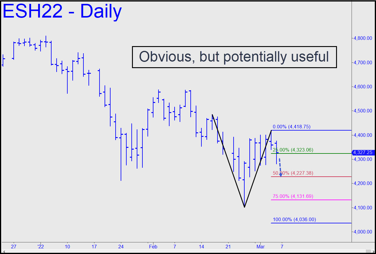 Last week’s high fell almost precisely at the ‘D’ target of a middling rABC pattern, presumably maxing out the upside for the moment, and that is why we can use the bearish pattern shown to get a handle on this vehicle in the week ahead despite its obviousness and plain-vanillaness. Most immediately, that would imply bottom-fishing at p=4227.38 as a tightly stopped scalp-trade, and subsequently shorting at the green line (x), assuming it’s hit via the right kind of bounce. For now, use 4227.38 as a minimum downside target for the near term. _______ UPDATE (Mar 7, 9:49 a.m. EST): It is unusual and mildly disconcerting for a perfectly located, 4227.38 midpoint support to have failed to gift us with a bottom-fishing trade. The futures fell to within an inch of the trigger price, then bounced sharply. The HP Method ‘textbook ‘ provides two possible explanations: 1) the droolers and algos have finally begun to recognize the usefulness of this key HP level; or, 2) buying power is waxing and was too strong to allow a correction to reach p. I lean toward the latter interpretation, but without necessarily having it negate the former. The implication is that this rally will at least exceed C=4418.75. Here’s the chart. [Further update, 10:40 a.m.: The bounce reached the green line (x=4323.06), but it did not qualify as a ‘mechanical’ short, since the bounce was coming off a low that had failed to touch p.] ______ UPDATE (Mar 7, 7:40 p.m.): Considering what’s going on in the world, sellers looked most unimpressive as they batted down the futures a measly 146 points. When they come to their senses, look for the S&Ps to fall 400-600 points in a day, an event that would be commensurate with the excesses that have preceeded it. In the meantime, expect more downside to at least 4036.00, the target shown in the original chart. It looks all but certain to be achieved because of today’s decisive breach of p=4227.38 and the close well below it. If it, too, fails as support, we’ll be looking at 3935.00 (move ‘A’ up to 4585.00 to see it). You can try bottom-fishing at either pivot, provided you’ve been short on the way down. One final note: The midpoint support associated with that last number is 4177.00, so be prepared for a short-squeeze bounce from very near there. _______UPDATE (Mar 9, 9:30 p.m.): The short squeeze unfolded almost precisely as expected, goosing the futures 160 points to a so-far high at 4298.25. In the chat room and in an intraday Notification sent out to subscribers, I mentioned a possible ‘reverse-pattern’ short from 4300 that was discussed in greater detail during today’s tutorial session. Another short geared for less experienced traders can be attempted with the point ‘c’ high anchored near 4323. See the Notification for additional details. _______ UPDATE (Mar 10, 11:46 p.m.): The night-shift dirtballs look like they’re struggling at the moment to shake down and exhaust sellers so that they can rig Friday’s opening. Their failure seems bullish to me, but if the futures open on a strong short-squeeze, I’d be tempted to fade the rally. Please nudge me in the chat room about this if I happen to be around.