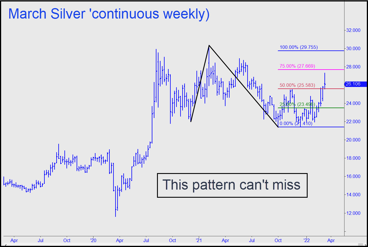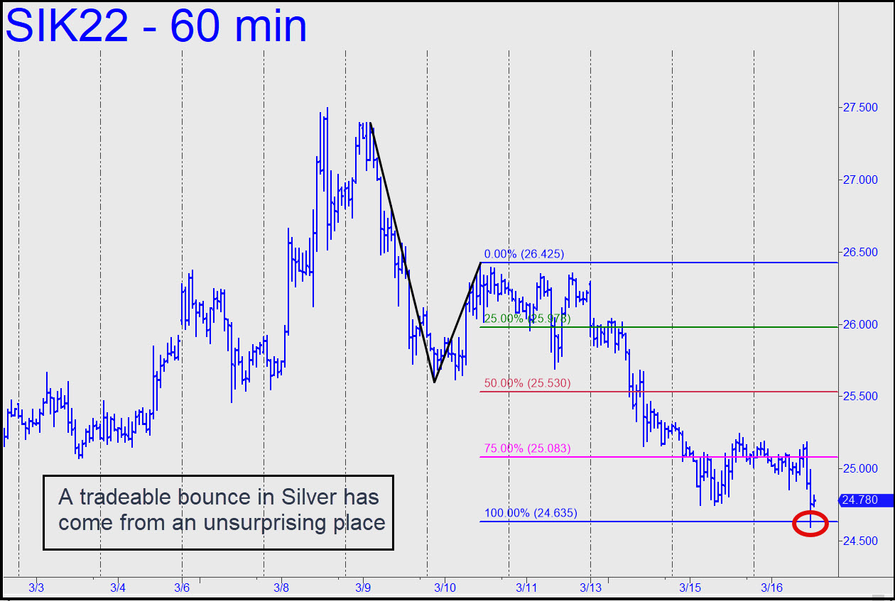 Use the arrestingly bullish pattern shown with high confidence in the weeks ahead, since it will allow you to do whatever you please with Silver, whether trading it or smugly anticipating its next move. It cannot miss because 1) it is so beautiful, featuring a spectacularly precise pullback from p=25.58, and 2) we are the only traders in the galaxy who know how to leverage it. The next possible ‘buy’ worth looking at would be a ‘mechanical’ at p=25.58, stop 24.19. Tune to the chat room, as always, for risk-mitigating details in real time. ______ UPDATE (Mar 14, 10:12 p.m.): The big picture pattern (inset), with vast spaces between levels, is intended only for subscribers familiar with Hidden Pivot tactics for greatly reducing risk. In this case, it amounts to about $28,000 on four contracts. A smaller, downtrending pattern, where a=27.39 on 3/9, suggest the low of this selloff will occur at or near 24.63. _______ UPDATE (Mar 16, 11:35 a.m.) As expected, the futures have taken a tradeable bounce from the 24.63 correction target drum-rolled above. The reversal occurred from within three cents of the Hidden Pivot, enabling at least one chat-room regular to report a profit on a partial exit. Whether the support will hold cannot be predicted at present, but if it gives way easily, that would be bearish, considering its compelling clarity. Here’s a chart that shows the bounce so far.