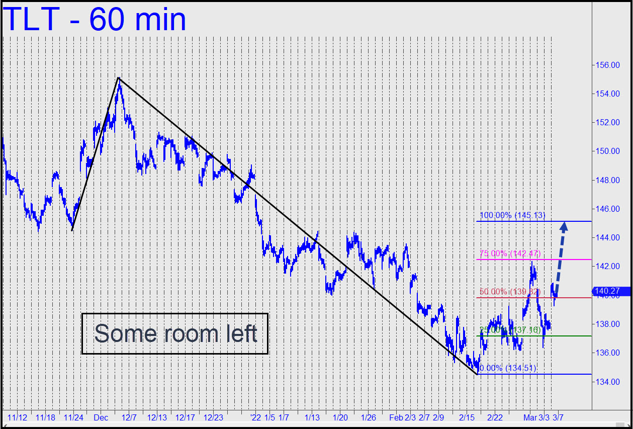 The strong leap that ended the week produced some instant quadruplers for subscribers who bought expiring at-the-money call options when TLT got bludgeoned down to the green line on Wednesday. This provided a textbook buying set-up for a ‘mechanical’ trade that, by its nature, will tend to scare the hell out of traders who act on the signal. The power of the bounce, in addition to the subsequent consolidation above p=139.32, have shortened the odds that the move will continue to at least 145.13, the ‘D’ rally target of the pattern shown. An easy move through it would be quite bullish. _______ UPDATE (Mar 7, 8:07 p.m. EST): If the pullback continues to the green line, it would trip an enticing ‘mechanical’ buy there, stop 134.50. Ask me in the chat room if you need more guidance to pare the risk. _______ UPDATE (Mar 8, 10:58 p.m. EST): Cancel the ‘mechanical’ bid, since we’ve seen a weak rally from just above it. If TLT relapses to x, it seems likely to exceed it. _____ UPDATE (Mar 10, 11:55 p.m. EST): Yuk! The selloff has exceeded Hidden Pivot supports and ‘discomfort’ zones — everything, in fact, except the key low at 113.19 recorded a year ago. Don’t count on it to hold, but its breach could still set up an appealing ‘counterintuitive’ play. For the rABC set-up, use a= 136.41 (3/2).