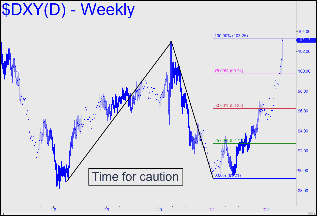 We’ve been using a big-picture rally target at 103.25, but let’s start the week with a focus on a more conservative target at 101.97 that looks all but certain to be achieved. Its main importance lies in its ability to tell us whether the steep uptrend might be losing steam. As always, an easy move through a Hidden Pivot resistance would portend more strength to come. The dollar’s rise matters a great deal because it raises the price of oil for most of the world outside the U.S., and because it increases the burden of debt for all who have borrowed dollars. _______ UPDATE (Apr 27, 11:18 p.m.): The dollar has very precisely hit an important target at 103.25 that took four years to achieve, so extra caution is warranted. We’ll move to the sidelines for now.