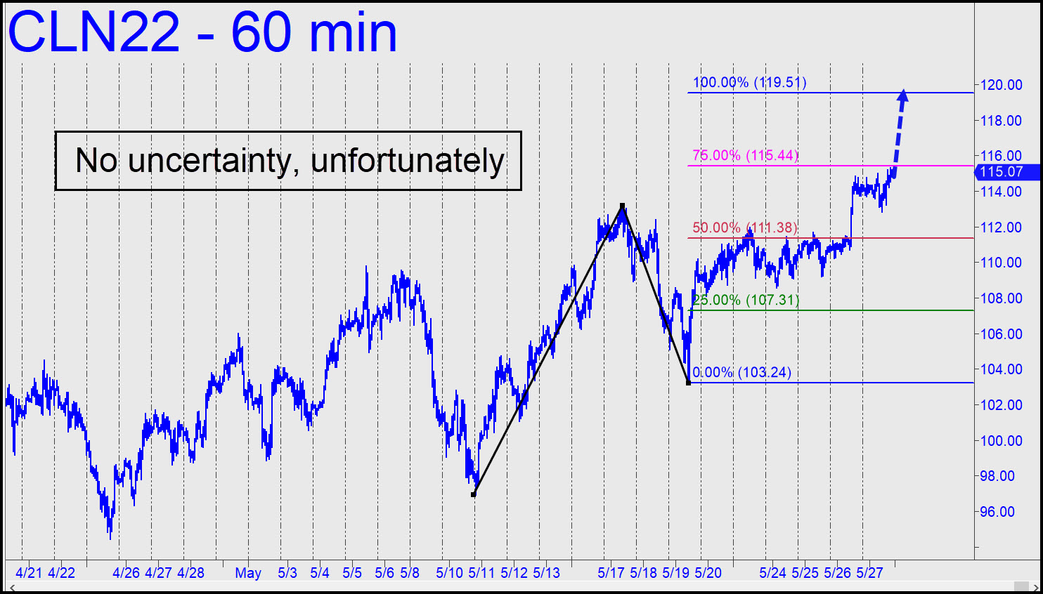 Unfortunately for the global economy, crude looks poised to move even higher, to at least the 119.51 target shown. We’ve been using an even loftier target at 140.12 that’s associated with a larger pattern tracing back to 2021. But let’s see how buyers handle the lower resistance before we try to gauge the staying power of the rally. The D resistance will be shortable, potentially with a very tight stop-loss, since it can be expected to show precise stopping power similar to what occurred at p=111.38. I recommend the trade if you’ve made money on the way to the target. _______ UPDATE (Jun 1, 1:38 p.m.): Here’s a pattern you can use to get a tradeable handle on crude over the next few days. Notice how it tripped a ‘mechanical’ winner earlier today.