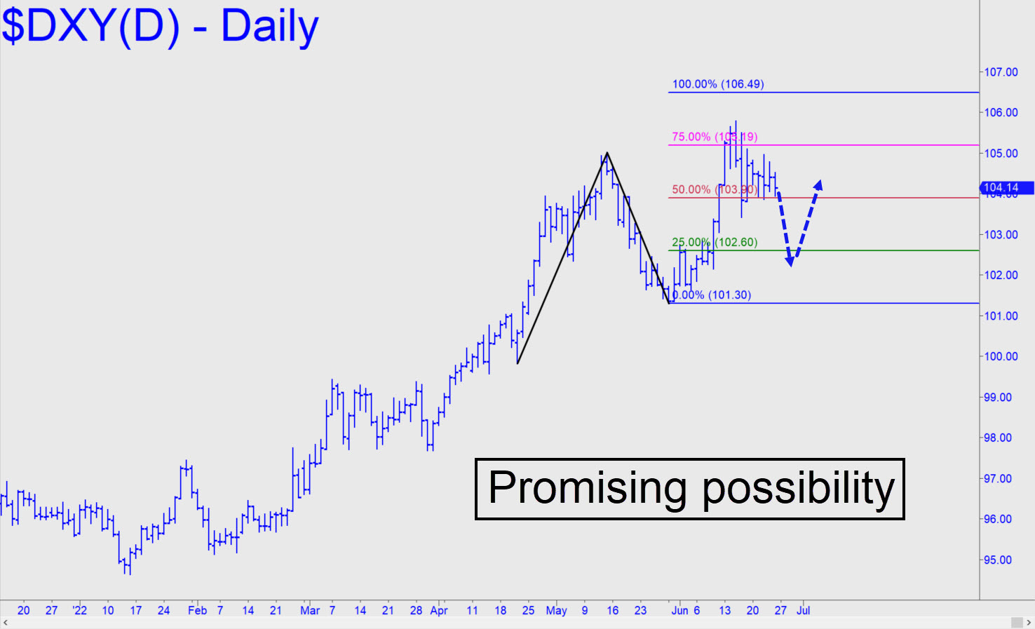The Dollar Index is working on a red-line ‘mechanical’ buy that was profitable the day after it triggered on June 16. The trade, which is predicated on a 106.49 rally target, is still in the black, but my hunch is that a better entry opportunity awaits when this vehicle falls to the green line, 102.80. In the meantime, although we hold no position officially, we can continue to monitor DXY closely for signs of presumably moderate weakness.
