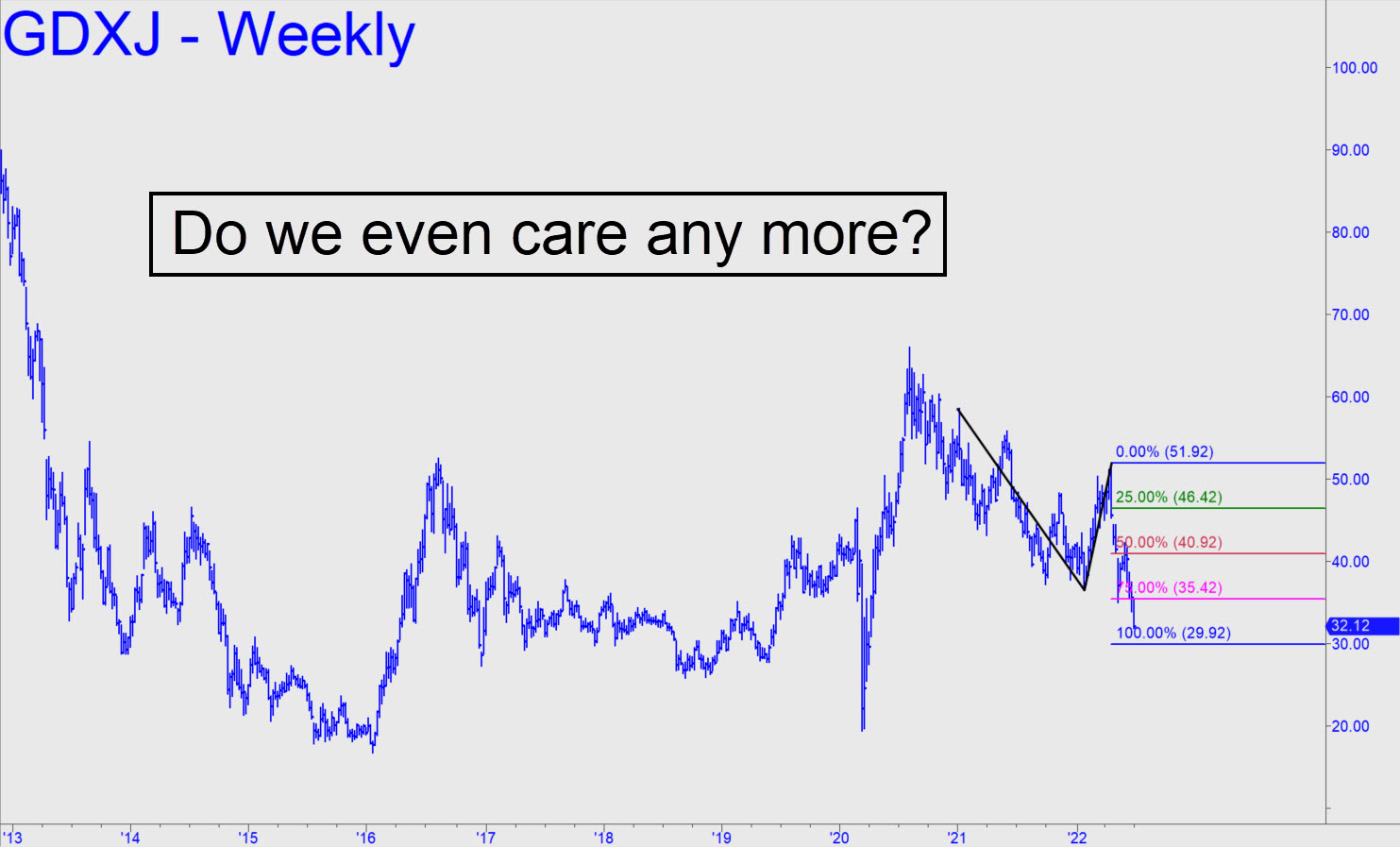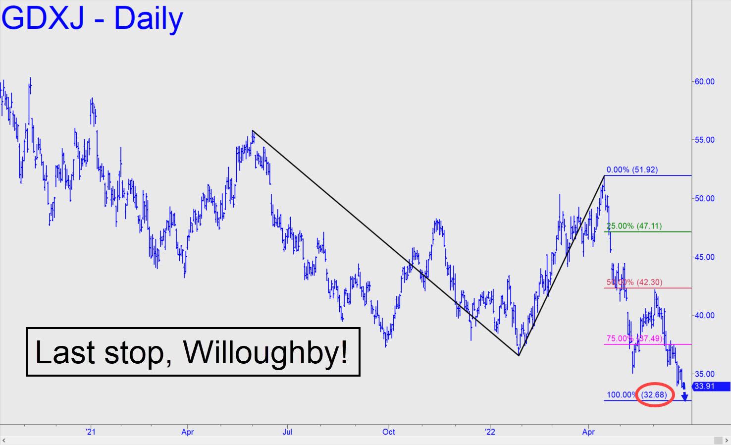 GDXJ bounce sharply Friday off a major downside target that has been a year in coming. I was reminded by a Pivoteer in the Trading Room that I had characterized the 34.10 ‘D’ target shown in the chart as a potential back-up-the-truck opportunity for bulls who have been patiently waiting for this cinder block to hit bottom. And perhaps it has, since the pattern is far too gnarly to have been queered by village idiots and algos who seem, finally, to have gotten the hang of reading conventional ABCD patterns. This one would not likely have been on their radar, even if it represents radical perfection in our playbook. It helps, too, that I myself had forgotten about the target and haven’t mentioned it in a long while. If you bought the low on Friday, please let me know in the chat room so that I can establish a tracking position. ______ UPDATE (Jun 28, 7:14 p.m.): Much as this little p.o.s. would love to keep falling just to make sure every bull has been squashed like a bug, it’s going to have one very tough time taking out the 32.68 Hidden Pivot support shown in this chart. Speculative buying, tightly stopped, is strongly encouraged, especially if you made money on the way down. Rookies looking for action can bid 32.71 for 200 shares, stop 32.49. _______ UPDATE (Jun 30, 3:54 p.m.): This turd is really starting to stink up the place. I’ve given up caring or even believing there has to be a bottom. But for anyone who is somehow still interested, the next logical downside target is 29.92. Bottom-fishing there is recommended if your hobby is losing money. Here’s the chart. ______ UPDATE (Jul 6, 1:59 p.m.):This bathyscaphe has bobbed up from a low today at 29.82. How shocking! See the chat room discussion, which includes a ‘forced’ bottom-fishing trade in August Gold that is currently taking on water. ______ UPDATE (Jul 7, 6:12 p.m.): GDXJ has lifted tentatively off a 29.82 low, but it’s too early to hazard a guess about how far the rally will go. In any event, it was a promising place for an important turn to have occurred. If you hold a long position tied to my guidance, please let me know in the chat room so that I can determine whether to provide tracking guidance. ________ UPDATE (Jull 8, 9:00 a.m.): Numerous subscribers reported getting long, so I am establishing a tracking position of 400 shares (or multiple thereof) from 29.92. For now, take profit on half at a current price of around 31.35. Use a 30.52 stop-loss for what remains. To simplify accounting, it can be carried for an adjusted cost-basis of 28.49.