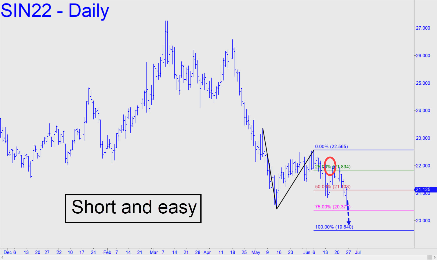 The futures tripped a promising ‘mechanical’ short on June 15 at 21.83, but we are just spectators, since no subscribers expressed an interest in the trade, let alone reported taking a position. The 19.64 target is valid and remains the worst-case scenario for the coming week, but it is no more likely to be reached than a comparable one in gold at 1756.90. You can try bottom-fishing at p2=20.37, which sits 5 points beneath May 13’s important low. That would make it a ‘discomfort zone’ trade, and it can be snagged using a ‘mechanical’ setup on a lesser chart. ______ UPDATE (Jul 1, 9:38 p.m.): Shifting to the September contract, this morning’s breach of an important hidden support implies more downside to at least D=18.96 (daily, A= 26.65 on 4/18; B=22.21 on 5/2). If that Hidden Pivot, too, is splattered, we would need to move A-B down to the next to produced a new target at 18.06, a p2 ‘secondary pivot’.