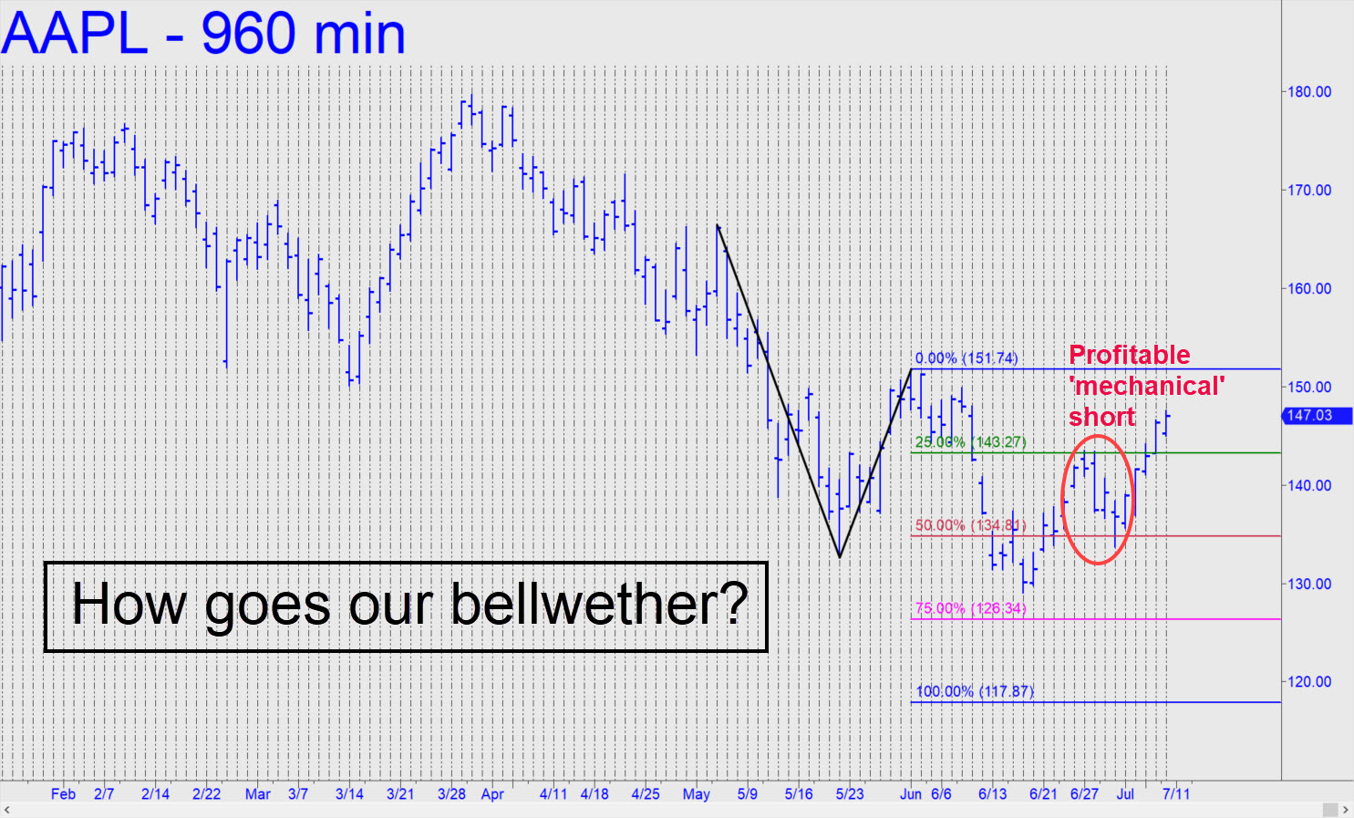 Our favorite stock-market bellwether had a decent week, with a 6% rally sufficiently lacking in excitement to suggest the stock’s handlers are quietly planning more of the same. The rally came on the heels of a successful ‘mechanical’ short from x=143.27 that I had recommended paper trading. The winning pullback did not so much suggest weakness as restfulness, and that’s why we should expect the current uptrend to take out C=151.74, even if there’s not much follow-through. Indeed, it would be a shocker — at least for me — if this bear squeeze makes it to 166.48 peak that I’ve used as the point ‘A’ high shown in the chart. _______ UPDATE (Jul 13, 10:01 p.m.): Portfolio managers who have lived effortlessly off AAPL over the years are prepared to move heaven and earth to stop out shorts above C=151.74. They will have their work cut out for them, since iPhone sales have never faced a global downturn remotely as menacing as the one that has already begun.