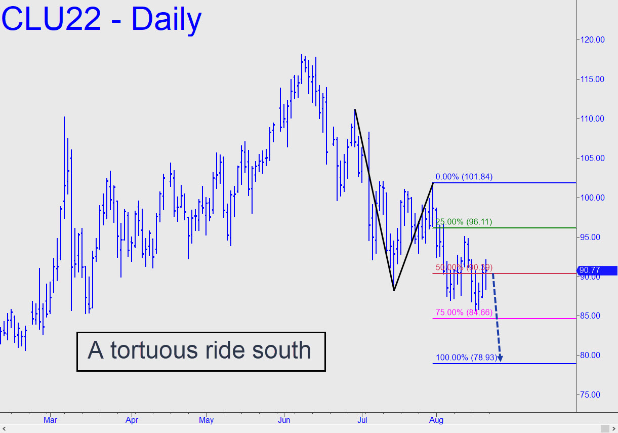 September Crude’s balky descent is still targeted most immediately on D=78.73, which if achieved would probably correspond to pump prices below $3 gallon. The felicity of this might not last, given that the largest commodity market on earth has become just another carny crap shoot made so opaque by refiners and cartels that even the Houston Chronicle’s intrepid energy reporters can’t quite explain how the rip-off works. The pattern is certainly tradeable even if the daily-chart version of it has yet to yield a ‘mechanical’ short. Exploiting it profitably will take some ‘camouflage’ and elbow grease — on your brain, that is — provided you’ve got the chops to rein in entry risk to no more than around $180 per contract. _______ UPDATE (Aug 23, 6:30 p.m.): The October contract appears headed toward a ‘voodoo’ level at around 97.50 whence a potentially tradeable turn could come. This would NOT be an actual reversal point, just a place to anchor an rABC set-up.