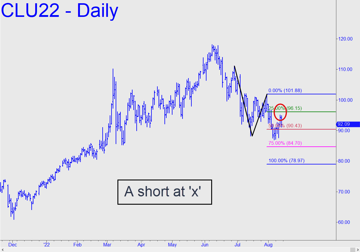 Crude would trigger a ‘mechanical’ short if it touches the green line x=96.15. However, because the impulse leg was such an agonizing slog, I can recommend this trade only to subscribers who know how to cut the implied theoretical entry risk of $23,000 on four contracts to perhaps a tenth of that. It would require close attention to ‘camouflage’ opportunities on the sub-15-minute charts, aka ‘camouflage. Merely spectating will have its rewards, since the next leg down should help snuff inflation at the pump as well as the unchecked greed of Big Oil. _______ UPDATE (Aug 15, 7:54 p.m.): Use the 81.79 target shown here as a minimum downside projection for the near term. If this Hidden Pivot support fails, the next step down would be to 78.93, calculated using A=111.14 from June 29. _______ UPDATE (Aug 18, 9:27): The failure of bears to reach p2=84.66 of the pattern shown in the thumbnail inset suggests it is on its way up to at least to the green line (x=96.11). It would trigger a ‘mechanical;’ short there, stop 101.85, but I am not recommending the trade because of the weakly erratic nature of the A-B impulse leg.