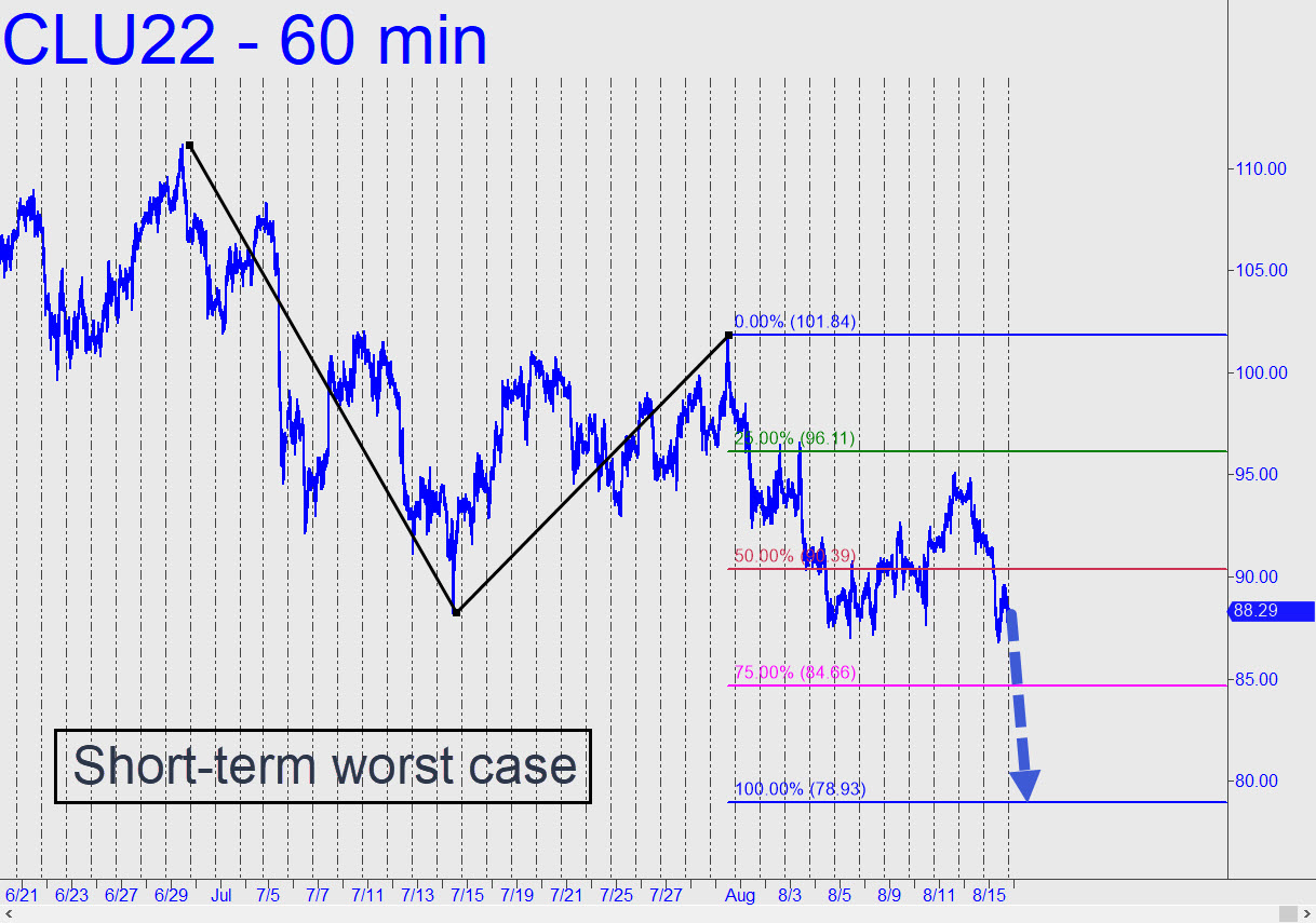Crude would trigger a ‘mechanical’ short if it touches the green line x=96.15. However, because the impulse leg was such an agonizing slog, I can recommend this trade only to subscribers who know how to cut the implied theoretical entry risk of $23,000 on four contracts to perhaps a tenth of that. It would require close attention to ‘camouflage’ opportunities on the sub-15-minute charts, aka ‘camouflage. Merely spectating will have its rewards, since the next leg down should help snuff inflation at the pump as well as the unchecked greed of Big Oil. _______ UPDATE (Aug 15, 7:54 p.m.): Use the 81.79 target shown here as a minimum downside projection for the near term. If this Hidden Pivot support fails, the next step down would be to 78.93, calculated using A=111.14 from June 29. _______ UPDATE (Aug 18, 9:27): The failure of bears to reach p2=84.66 of the pattern shown in the thumbnail inset suggests it is on its way up to at least to the green line (x=96.11). It would trigger a ‘mechanical;’ short there, stop 101.85, but I am not recommending the trade because of the weakly erratic nature of the A-B impulse leg.
