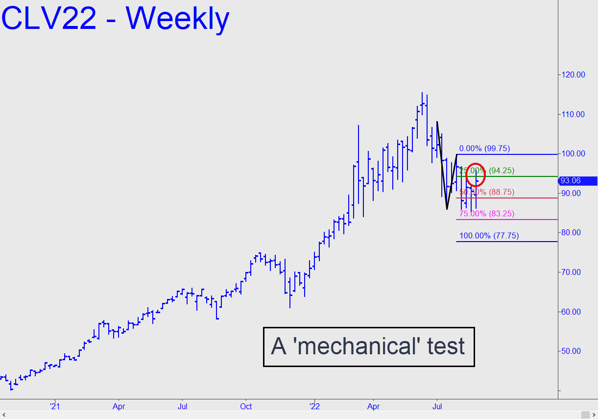 Last week’s rally could provide a crucial test for my bearish outlook, since it triggered an attractive ‘mechanical’ short at the green line after bouncing from a low in the pattern’s sweet spot. The theoretical position was slightly profitable at the bell, but we are paper trading it in any event because the entry risk is about $22,000 on four contracts. To qualify the word ‘attractive’, it implies that a short from 94.24 has a better than 50% chance of producing a profit by falling to p=88.75, at least, before popping above C=99.75 to stop out the position. ________ UPDATE (Aug 31, 11:50 p.m.): So far so good. The futures produced a $22,000 profit on the paper trade with today’s dive to p=88.75. Assuming half the position has been covered, let’s shoot for p2= 83.25 on the third of four contracts shorted. Note the D target at 77.75, which, as noted here earlier, would imply pump prices below $3 gallon. _______ UPDATE (Sep 1, 11:24 p.m.): Use a stop-loss at 91.43 for the two contracts that remain. This should be worked o-c-o with an order to cover one contracts at p2=83.25. _______ UPDATE (Sep 7, 10:16 p.m.): The trade has been a monster, producing one of the biggest gains ever for an explictly actionable tout. The trend forecast itself went sharply against the crowd, with an extremely bearish forecast at a time when most other seers were expecting a run-up to above $100. That said, there has been almost no discussion of the trade, or even of crude oil, in the tradng room, so NYMEX futures will be eliminated from the core list of touts. However, I will still provide coverage of this vehicle and energy proxies on-demand in the trading room.