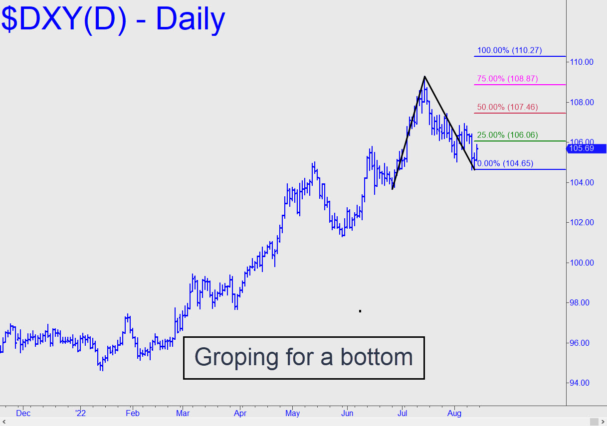 Groping for a bottom, the Dollar Index has already triggered one false ‘buy’ signal this month. A new signal would be generated by a 106.06 print, but we’ll need to monitor the lesser charts if and when it gets there to determine whether the rally is for real. If so, that would imply minimum upside thereafter to at least 107.46, the midpoint Hidden Pivot resistance of the pattern shown. If the trend pushes easily past it, we could be looking at new highs by mid- to late September. _______ UPDATE (Aug 15, 8:00 p.m.): The decisive pop through 106.06 implies the rally is bound for a minimum p2=107.46. _______ UPDATE (Aug 18, 9:41 p.m.): And now today’s pop through p=107.46 strongly implies that p2=108.87 will be reached. That will of course set up a test of July 14’s importnnt peak at 109.29. Keep D=110.27 in mind if and when p2 gives way.